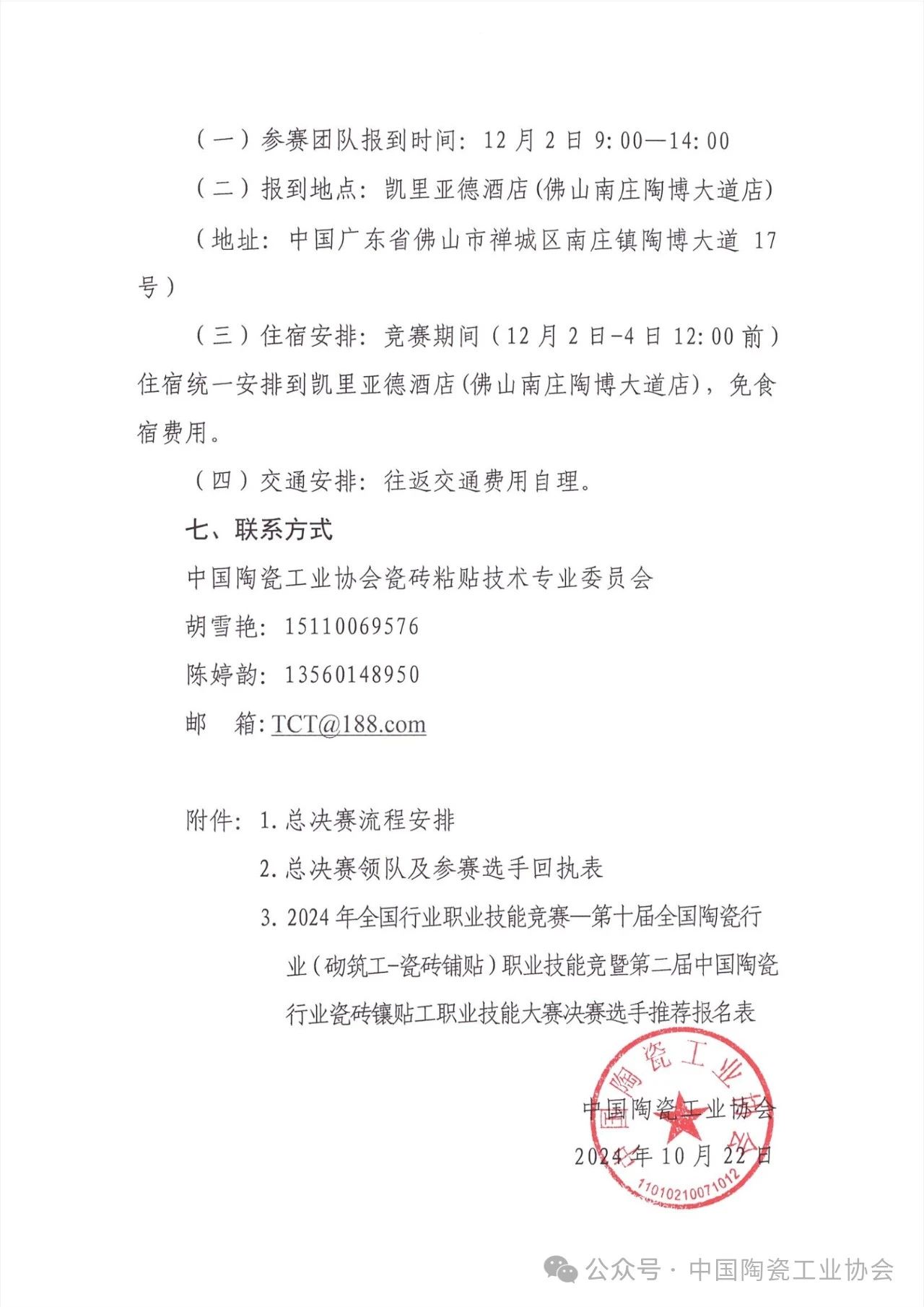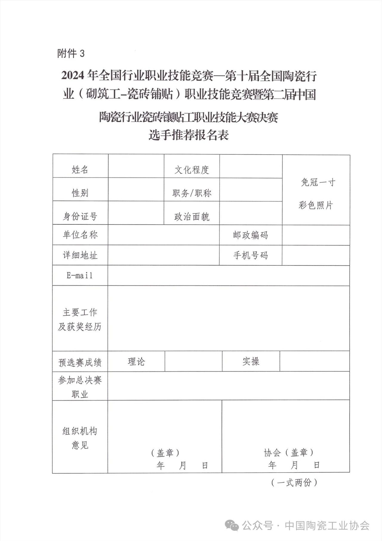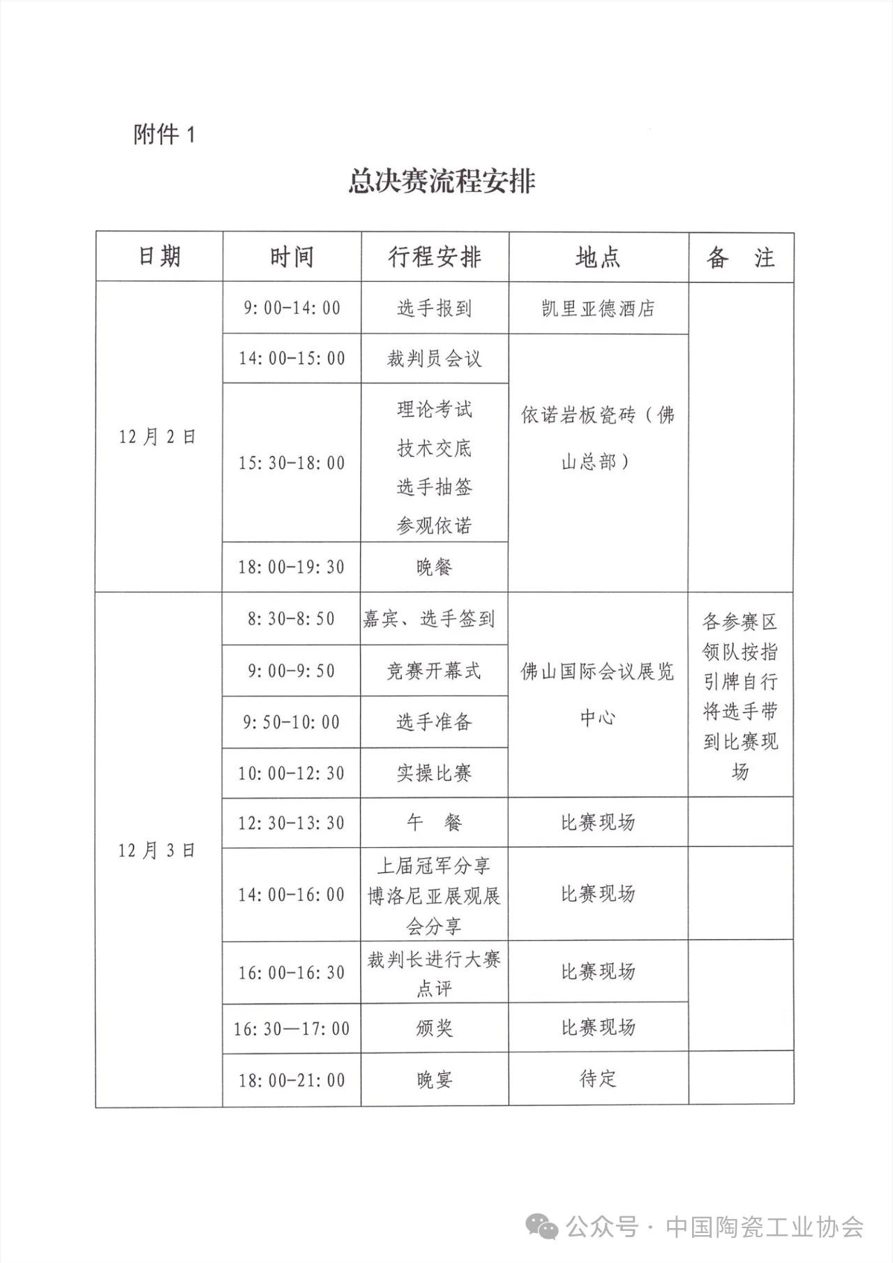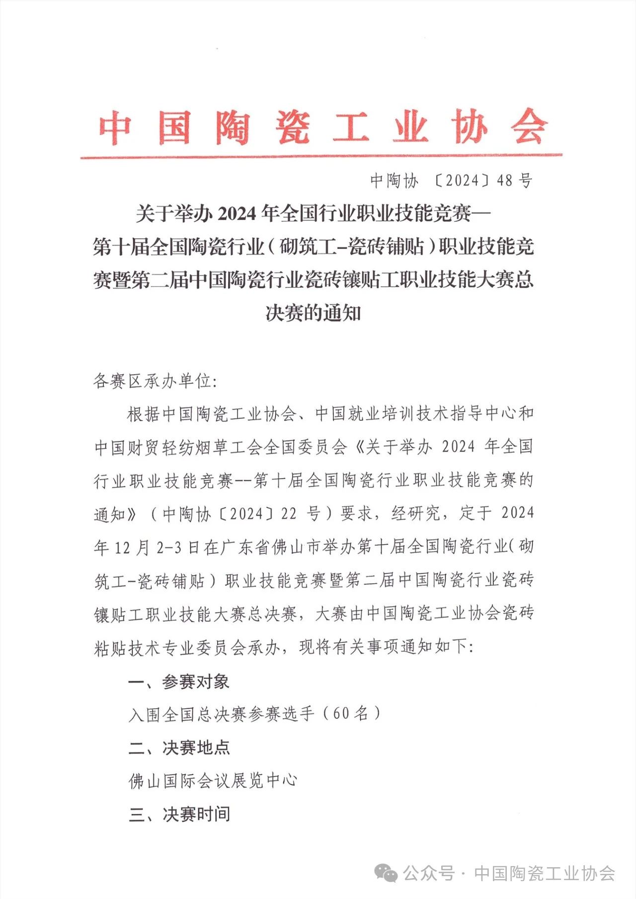 【通知】2024年第十屆全國陶瓷行業(yè)(砌筑工-瓷磚鋪貼)職業(yè)技能競賽暨第二屆中國陶瓷行業(yè)瓷磚鑲貼工職業(yè)技能大賽總決賽的通知