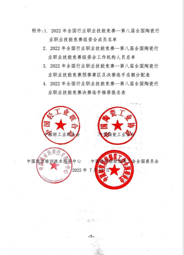 ? ? ? 為貫徹落實習(xí)近平總書記對技能人才工作的系列重要指示精神,大力弘揚(yáng)勞模精神、勞動精神、工匠精神,激勵更多勞動者特別是青年一代走技能成才、技能報國之路,培養(yǎng)更多高技能人才和大國工匠,促進(jìn)就業(yè)創(chuàng)業(yè)和高質(zhì)量發(fā)展,經(jīng)人力資源社會保障部同意,中國輕工業(yè)聯(lián)合會、中國陶瓷工業(yè)協(xié)會、中國就業(yè)培訓(xùn)技術(shù)指導(dǎo)中心、中國財貿(mào)輕紡煙草工會全國委員會決定共同舉辦2022年全國行業(yè)職業(yè)技能競賽--第八屆全國陶瓷行業(yè)職業(yè)技能競賽(簡稱“第八屆陶瓷技能競賽”)。本次競賽已列入2022年全國行業(yè)職業(yè)技能競賽計劃,為國家級二類職業(yè)技能競賽?,F(xiàn)將有關(guān)事項通知如下: