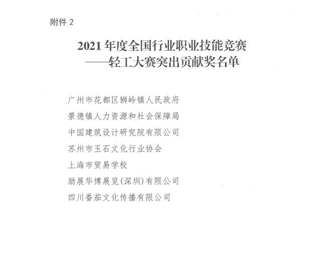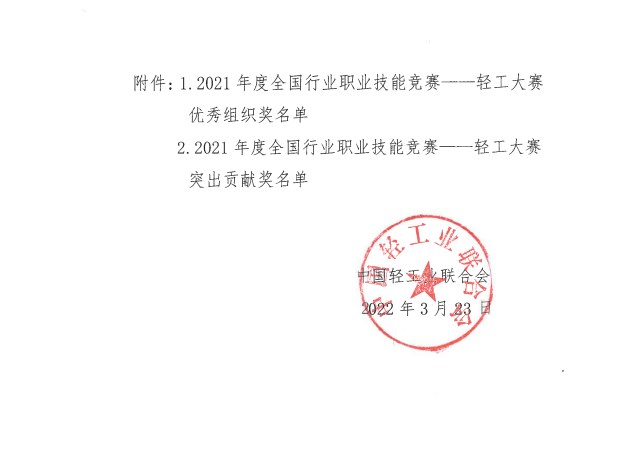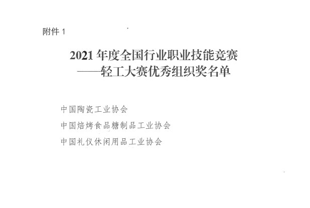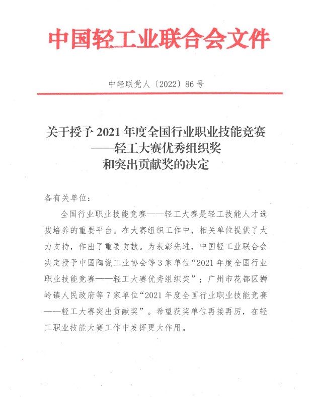 中國陶瓷工業(yè)協(xié)會榮獲“2021年度全國行業(yè) 職業(yè)技能競賽—輕工大賽優(yōu)秀組織獎”
