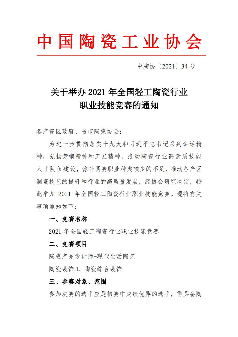 為進一步貫徹落實十九大和習近平總書記系列講話精神,弘揚勞模精神和工匠精神,推動陶瓷行業(yè)高素質(zhì)技能人才隊伍建設,彌補國賽職業(yè)種類較少的不足,推動各產(chǎn)區(qū)制瓷技藝的提升和行業(yè)的高質(zhì)量發(fā)展,經(jīng)協(xié)會研究決定,特此舉辦2021年全國輕工陶瓷行業(yè)職業(yè)技能競賽?,F(xiàn)將有關事項通知如下: