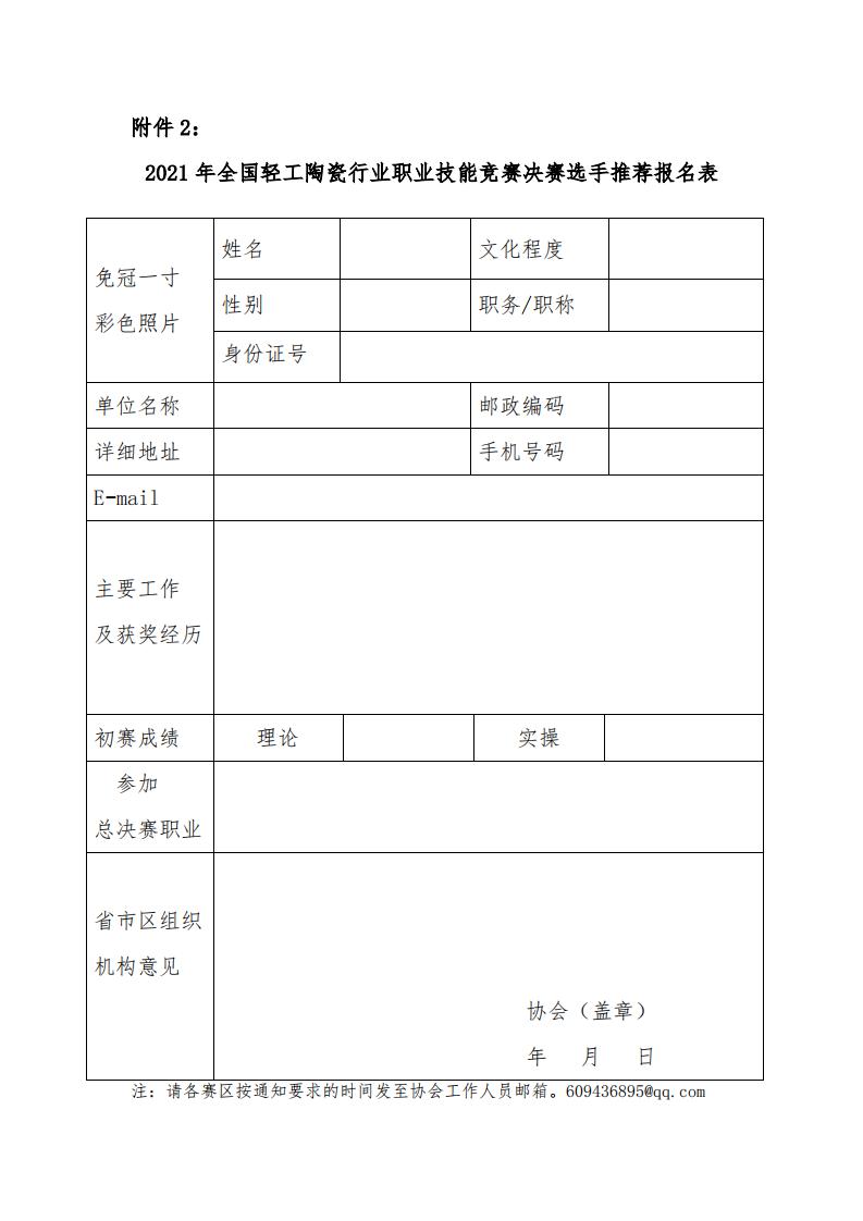 ? ? ? 2.2021年全國輕工陶瓷行業(yè)職業(yè)技能競賽決賽選手 推薦報名表