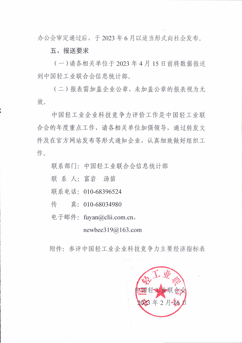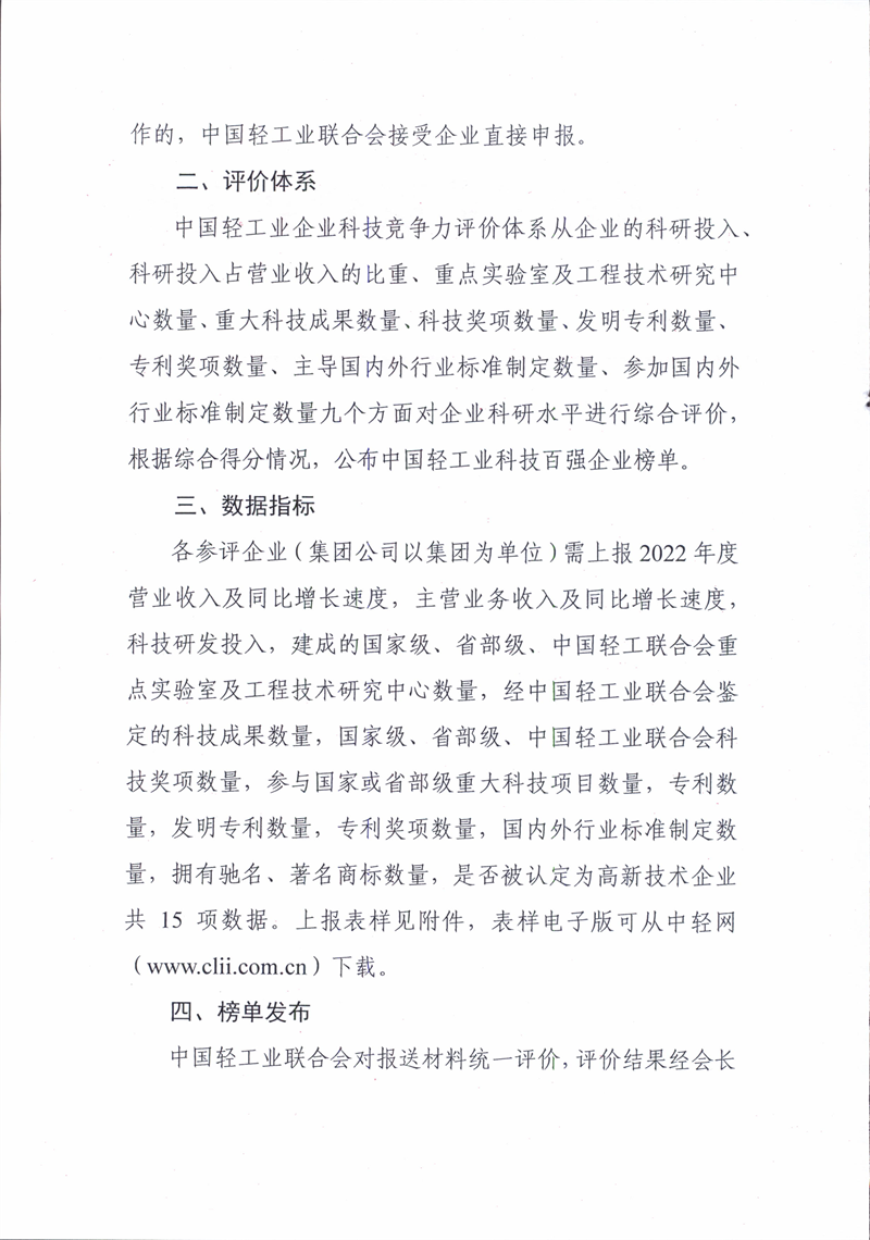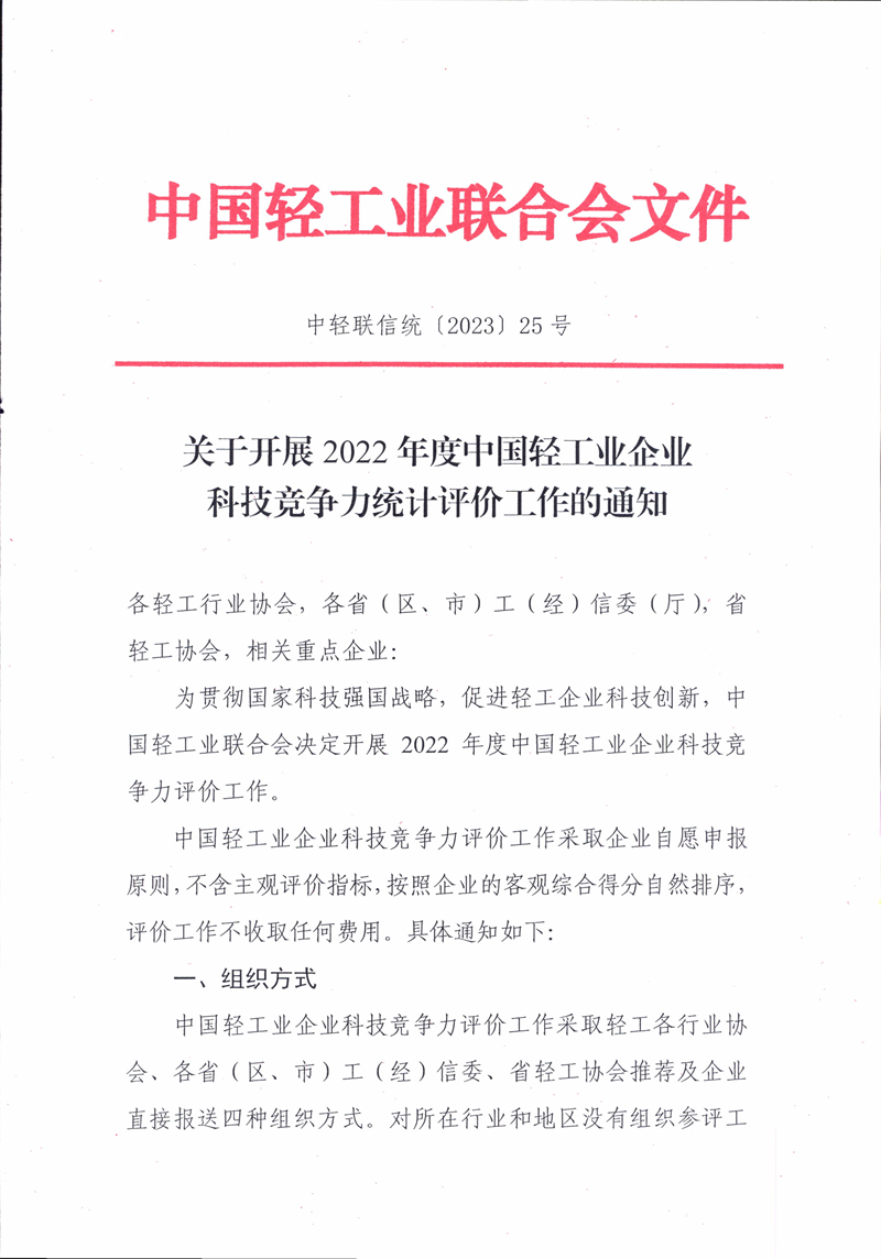 關(guān)于開展 2022 年度中國輕工業(yè)企業(yè)科技競爭力統(tǒng)計評價工作的通知