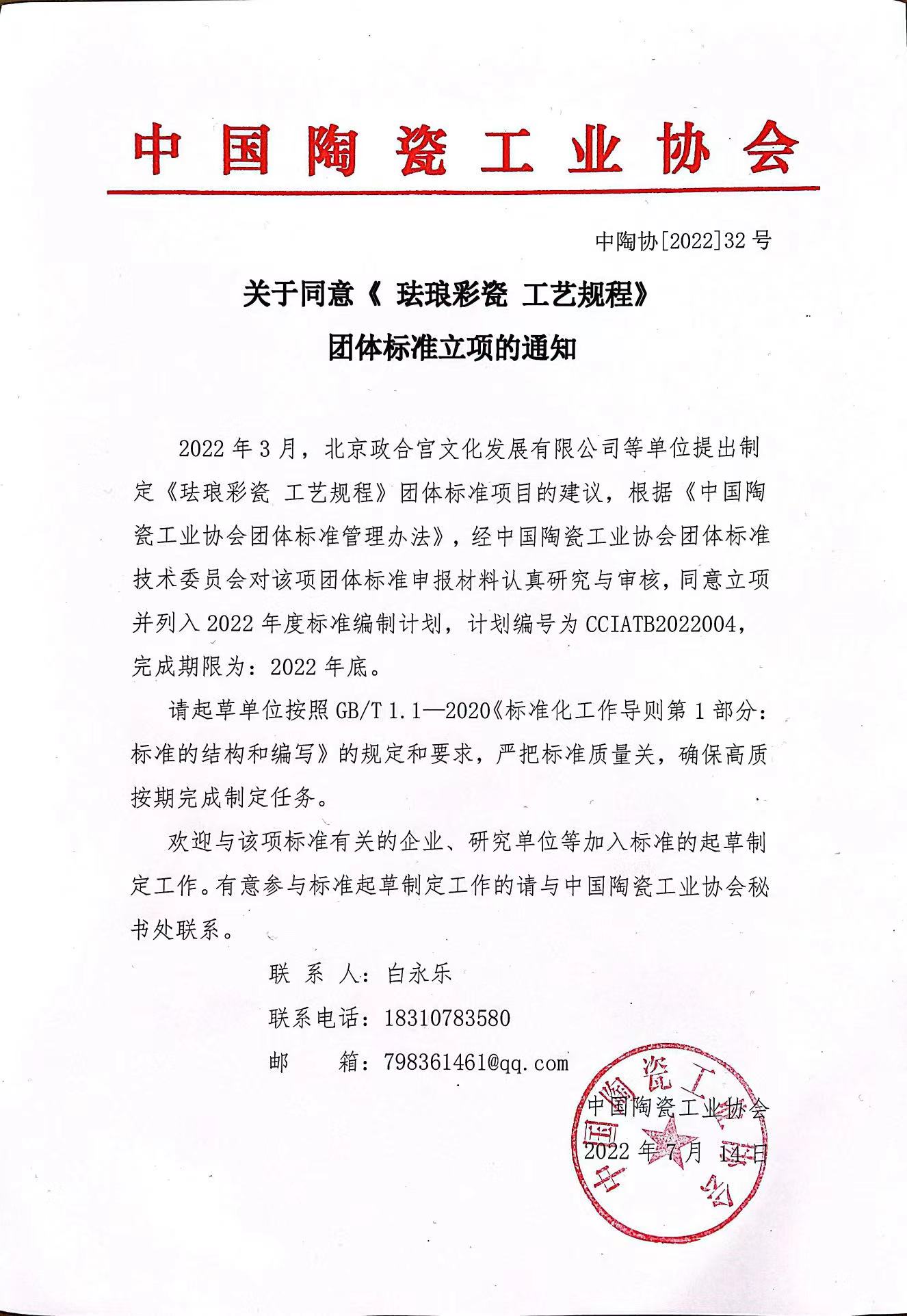 2022年3月,北京政合宮文化發(fā)展有限公司等單位提出制定《琺瑯彩瓷 工藝規(guī)程》團體標準項目的建議,根據(jù)《中國陶瓷工業(yè)協(xié)會團體標準管理辦法》,經(jīng)中國陶瓷工業(yè)協(xié)會團體標準技術委員會對該項團體標準申報材料認真研究與審核,同意立項并列入2022年度標準編制計劃,計劃編號為CCIATB2022004,完成期限為:2022年底。