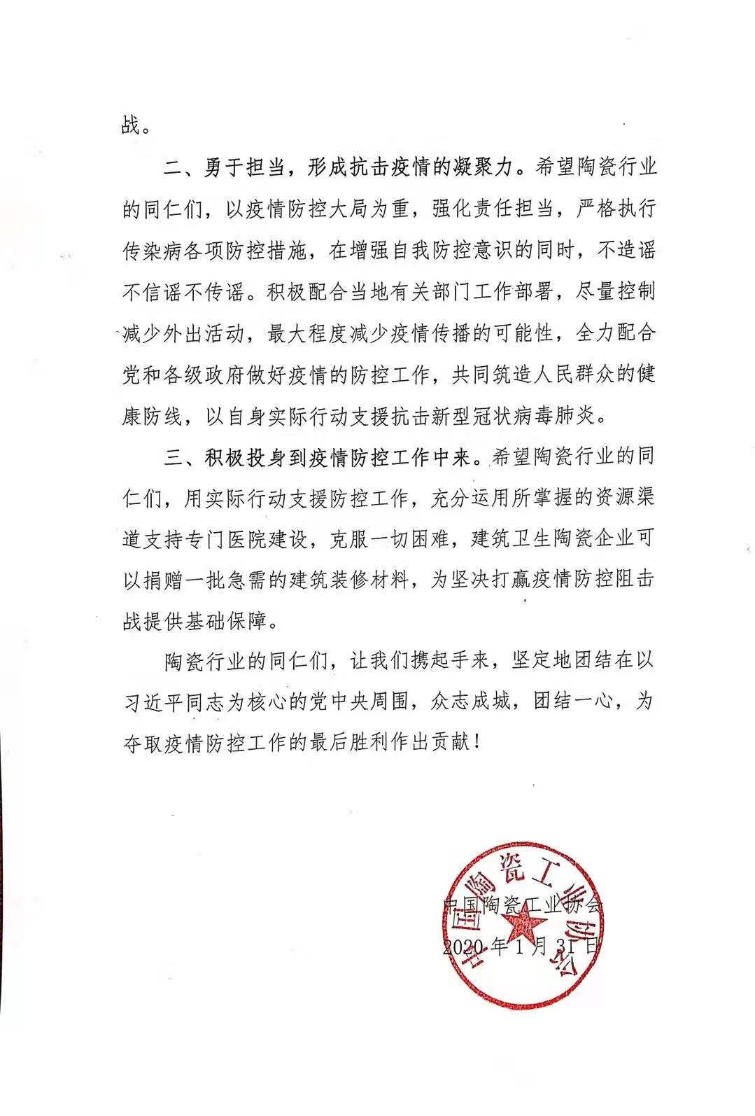 三、積極投身到疫情防控工作中來。希望陶瓷行業(yè)的同仁們,用實際行動支援防控工作,充分運用所掌握的資源渠道支持專門醫(yī)院建設,克服一切困難,建筑衛(wèi)生陶瓷企業(yè)可以捐贈一批急需的建筑裝修材料,為堅決打贏疫情防控阻擊戰(zhàn)提供基礎保障。