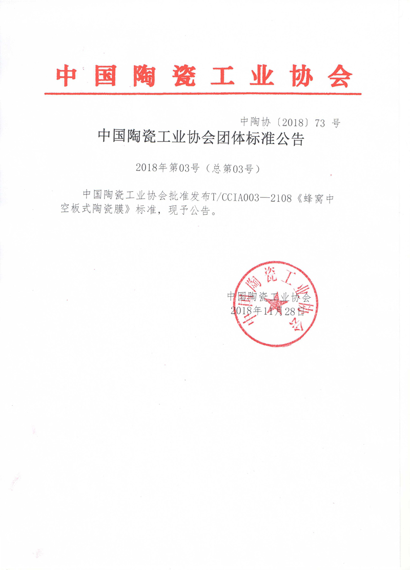 中國(guó)陶瓷工業(yè)協(xié)會(huì)批準(zhǔn)發(fā)布T /CCIA003-2108 《蜂窩中空板式陶瓷膜》標(biāo)準(zhǔn),現(xiàn)予公告。