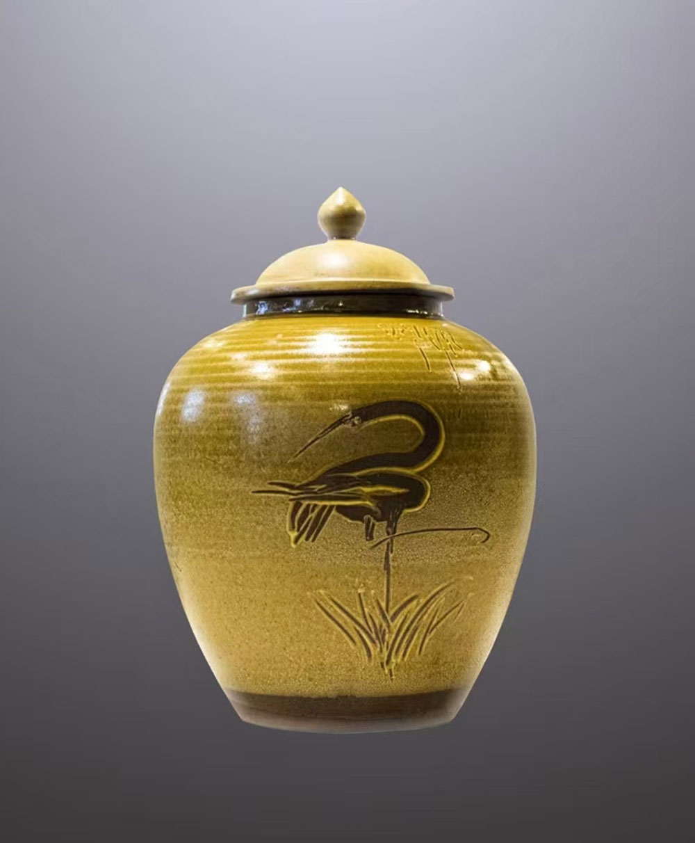 書畫、水花的傳統(tǒng)裝飾技藝,其中“水花”是管窯最具有標(biāo)志性特色的陶器裝飾工藝。其工藝流程為:使用黃白膠泥手工拉坯成型,陶坯干后,在表面刷一層管窯傳統(tǒng)的白色化妝土,化妝土處于半干半濕時(shí),用自制工具快速刻畫出紋樣,形成凹痕,等待坯干后,再上草木灰釉,入窯燒至1200度成器。何良法的作品水花圓壇(圖2)運(yùn)用水花工藝,刻畫了一只側(cè)身回首的仙鶴雙腿交錯(cuò),獨(dú)立于水邊的水草之上。仙鶴的腳抬起90度,幾乎與地面平行,仿佛是瞬間彈起,通過這樣的造型,生動表現(xiàn)了仙鶴回首抬腳的瞬間,鶴的形象優(yōu)雅且充滿動感,與水草形成畫面的平衡。從筆痕可以看出,刻畫一氣呵成,線條粗細(xì)變化且富有彈性,鶴的神韻淋漓展現(xiàn),“逸筆草草,不求形似”。水花將中國畫的寫意性與陶瓷工藝完美融合,而這正是管窯陶瓷極具地域性特色的藝術(shù)表現(xiàn),是管窯陶藝術(shù)的靈魂基因。值得一提的是,這種類似的圓壇子在過去是管窯老百姓存放紅薯片、蠶豆、花生等食物的普通日常用品。“柿外陶園”將管窯傳統(tǒng)技藝深入挖掘,沉淀打磨,結(jié)合老百姓的審美,使得放食物圓壇子成為了實(shí)用性的工藝品,起到了提升人們審美和生活品質(zhì)的作用,是日用陶向工藝陶轉(zhuǎn)化的非常重要的一步。
