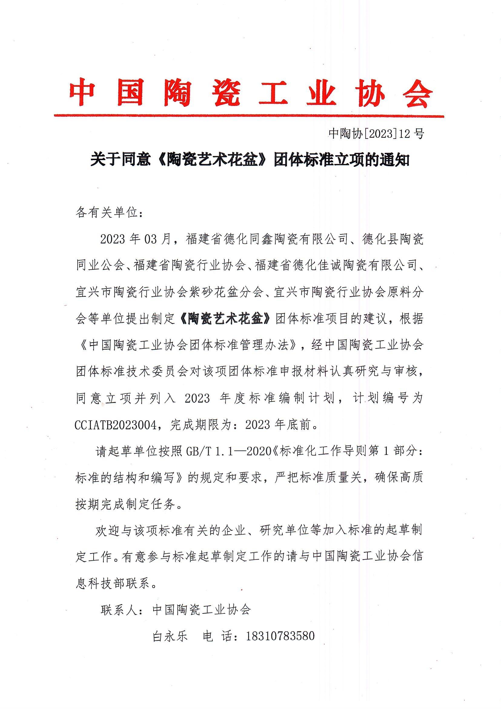 2023年03月,福建省德化同鑫陶瓷有限公司、德化縣陶瓷同業(yè)公會、福建省陶瓷行業(yè)協(xié)會、福建省德化佳誠陶瓷有限公司、宜興市陶瓷行業(yè)協(xié)會紫砂花盆分會、宜興市陶瓷行業(yè)協(xié)會原料分會等單位提出制定《陶瓷藝術(shù)花盆》團(tuán)體標(biāo)準(zhǔn)項(xiàng)目的建議,根據(jù)《中國陶瓷工業(yè)協(xié)會團(tuán)體標(biāo)準(zhǔn)管理辦法》,經(jīng)中國陶瓷工業(yè)協(xié)會團(tuán)體標(biāo)準(zhǔn)技術(shù)委員會對該項(xiàng)團(tuán)體標(biāo)準(zhǔn)申報(bào)材料認(rèn)真研究與審核,同意立項(xiàng)并列入2023年度標(biāo)準(zhǔn)編制計(jì)劃,計(jì)劃編號為CCIATB2023004,完成期限為:2023年底前。