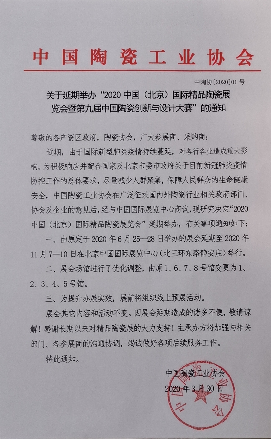 近期,由于國際新型肺炎疫情持續(xù)蔓延,對各行各業(yè)造成重大影響。為積極響應(yīng)并配合國家及北京市委市政府關(guān)于目前新冠肺炎疫情防控工作的總體要求,盡量減少人群聚集,保障人民群眾的生命健康安全,中國陶瓷工業(yè)協(xié)會(huì)在廣泛征求國內(nèi)外陶瓷行業(yè)相關(guān)政府部門、協(xié)會(huì)及企業(yè)的意見后,經(jīng)與中國國際展覽中心商議,現(xiàn)研究決定“2020中國(北京)國際精品陶瓷展覽會(huì)”延期舉辦,有關(guān)事項(xiàng)通知如下: