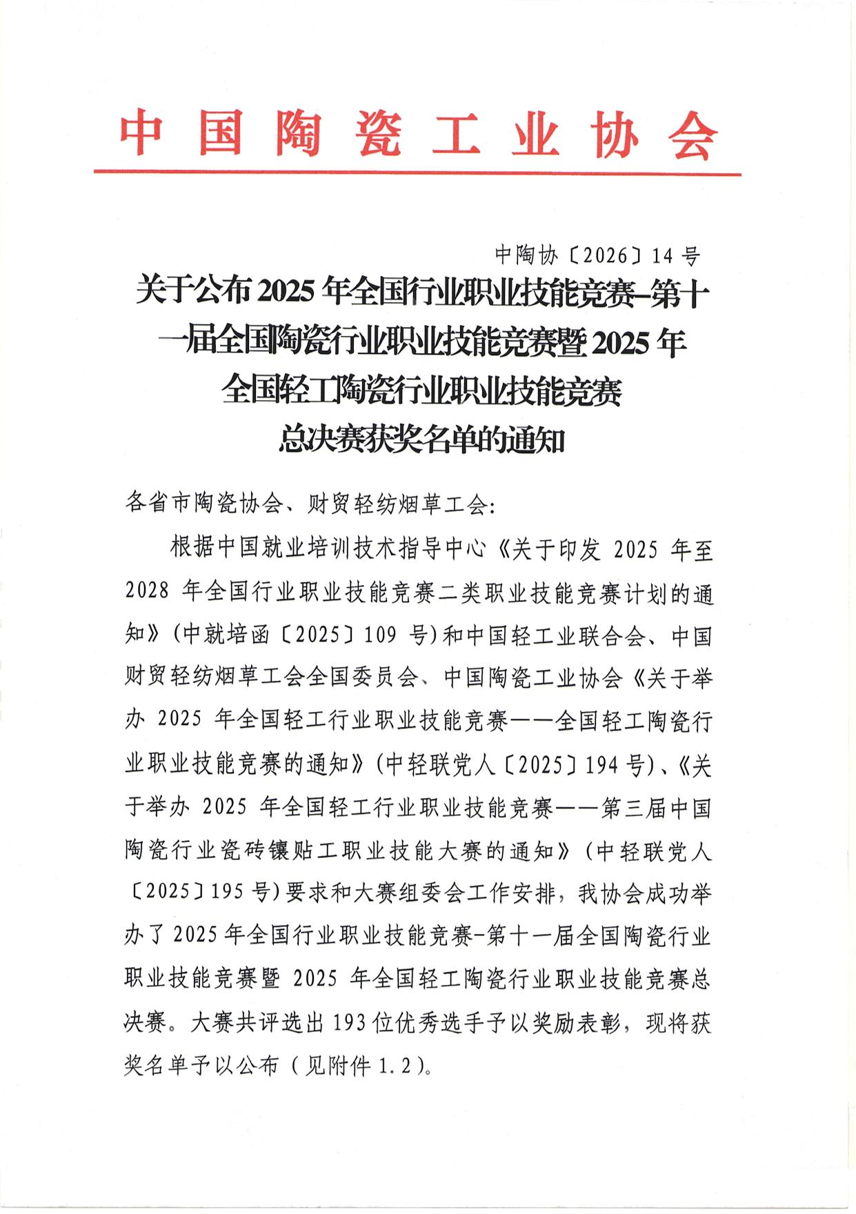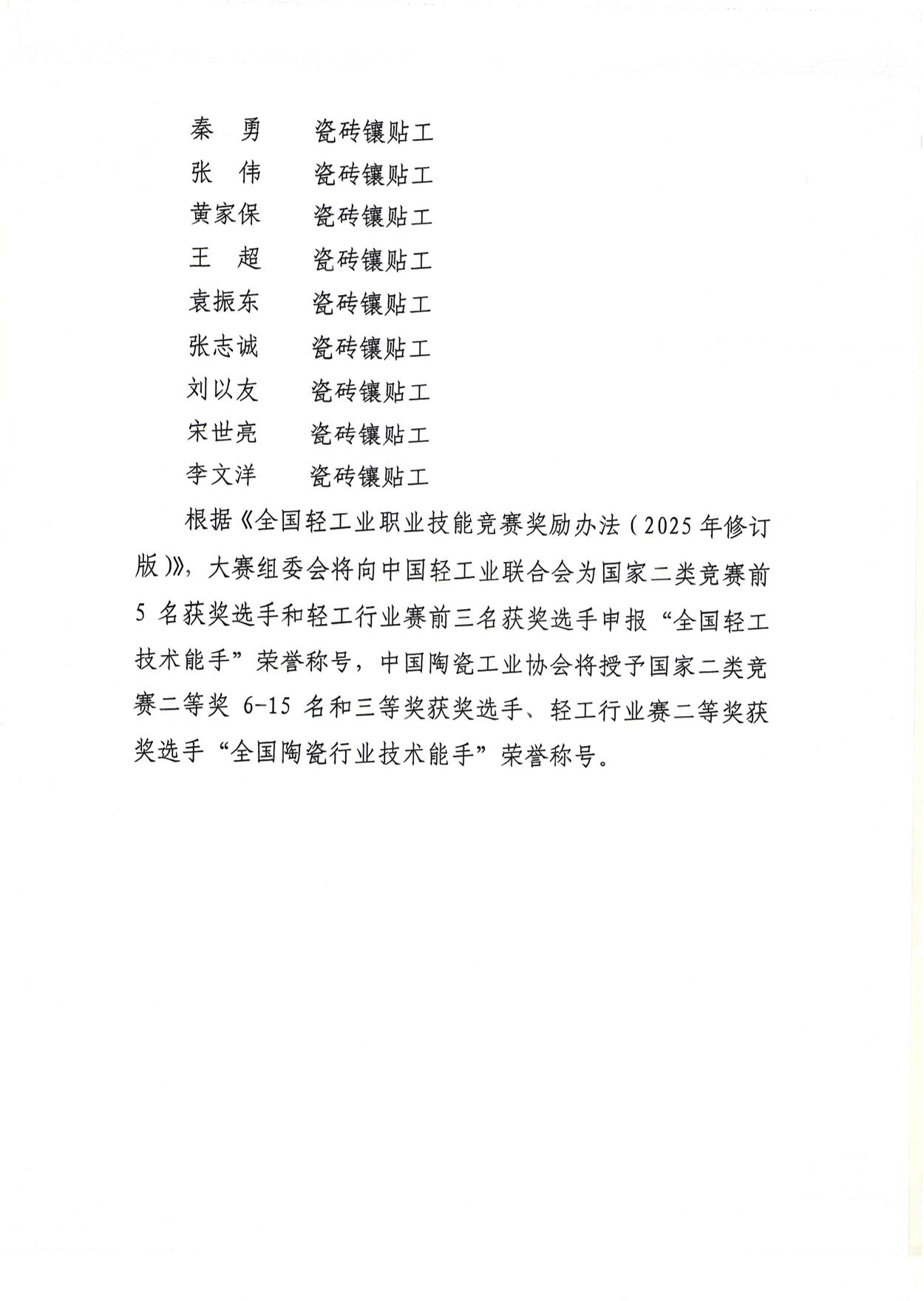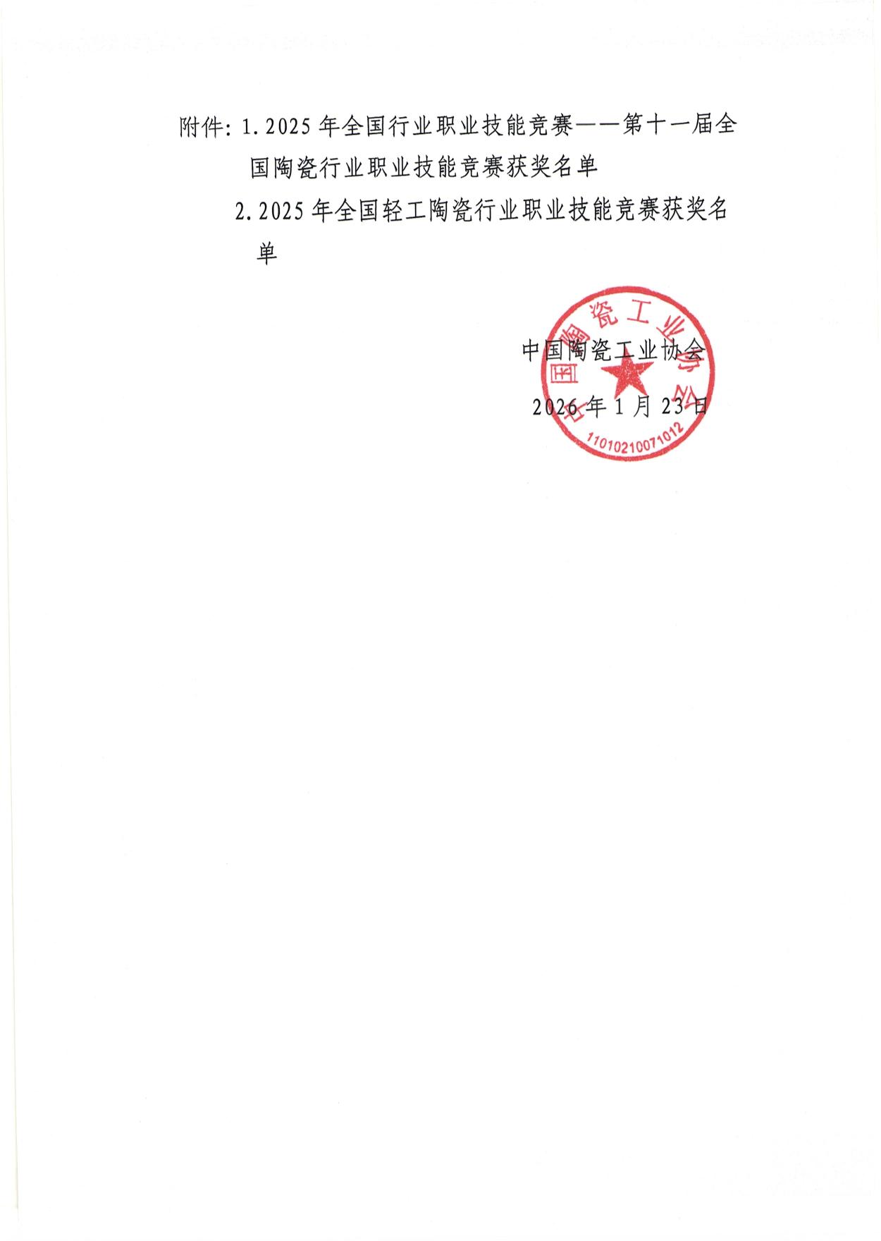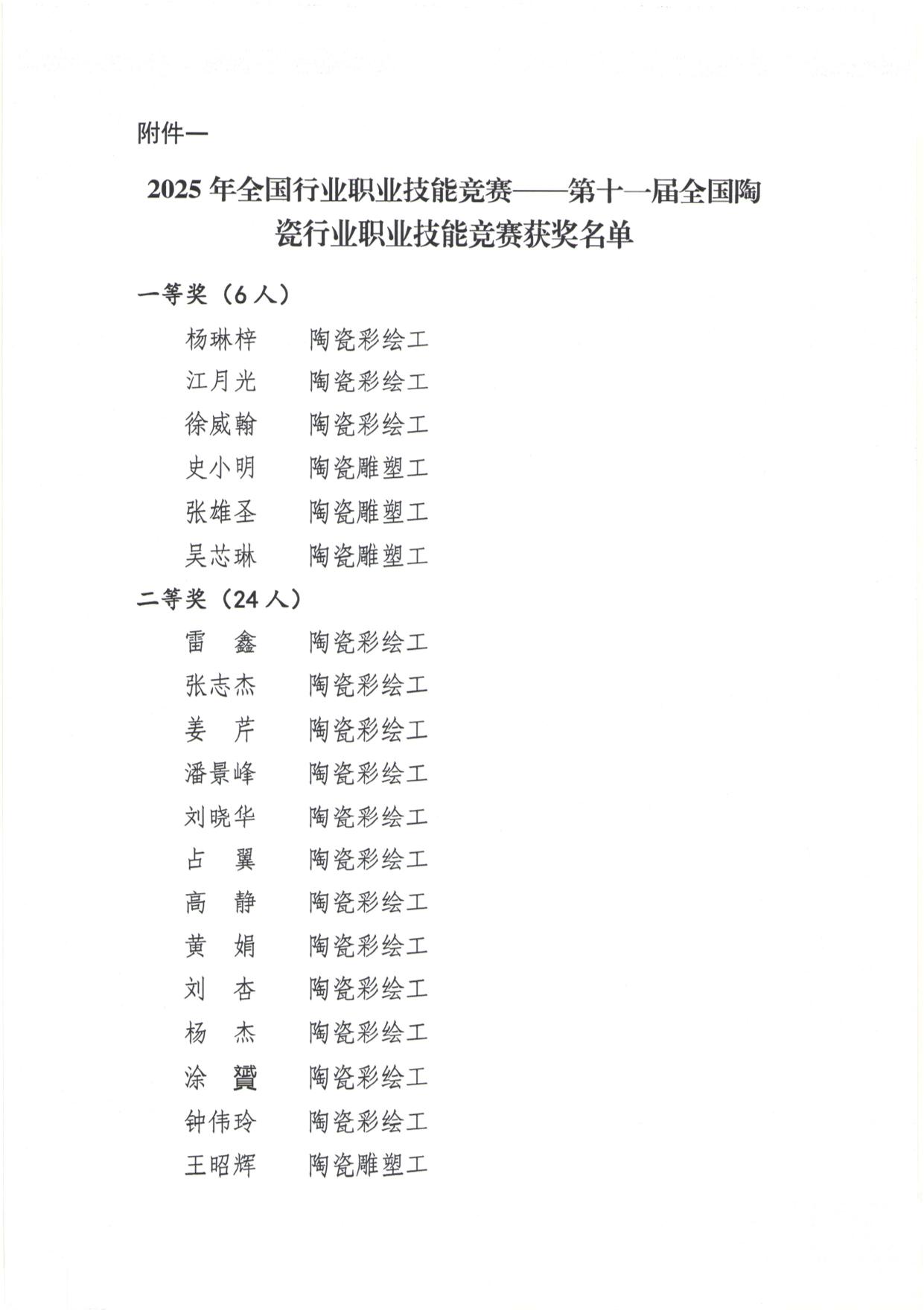 關(guān)于公布2025年全國行業(yè)職業(yè)技能競賽-第十一屆全國陶瓷行業(yè)職業(yè)技能競賽暨2025年全國輕工陶瓷行業(yè)職業(yè)技能競賽總決賽獲獎(jiǎng)名單的通知