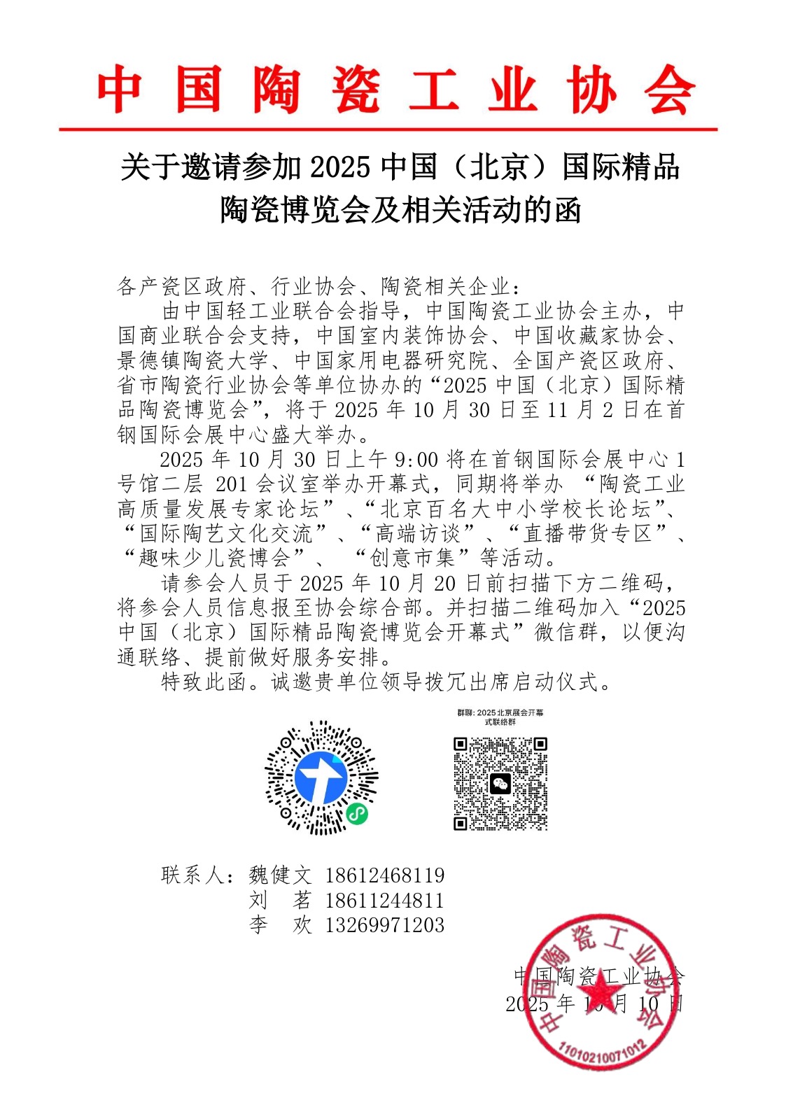 關(guān)于邀請參加2025中國(北京)國際精品陶瓷博覽會(huì)及相關(guān)活動(dòng)的函