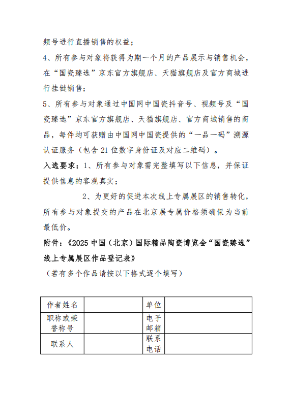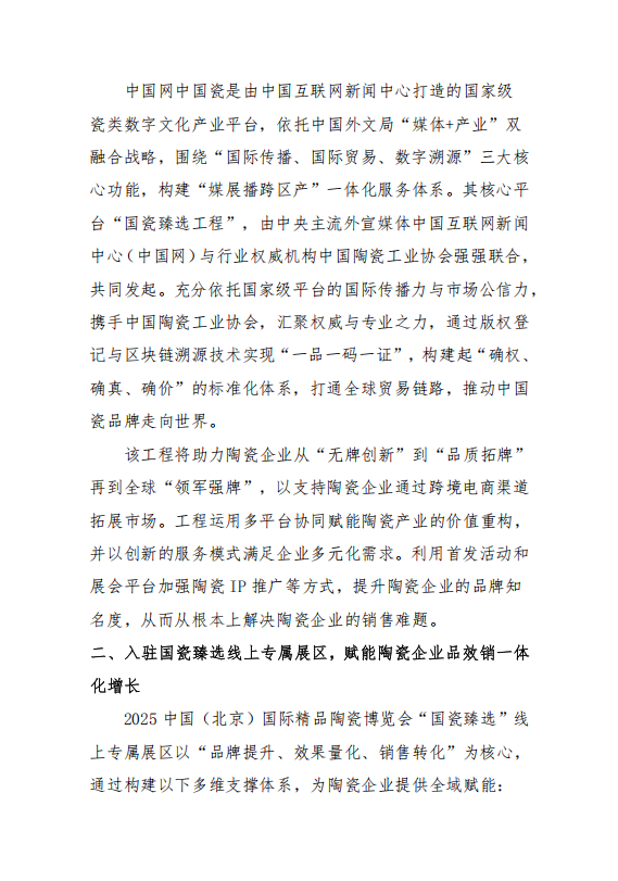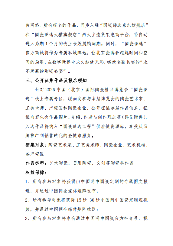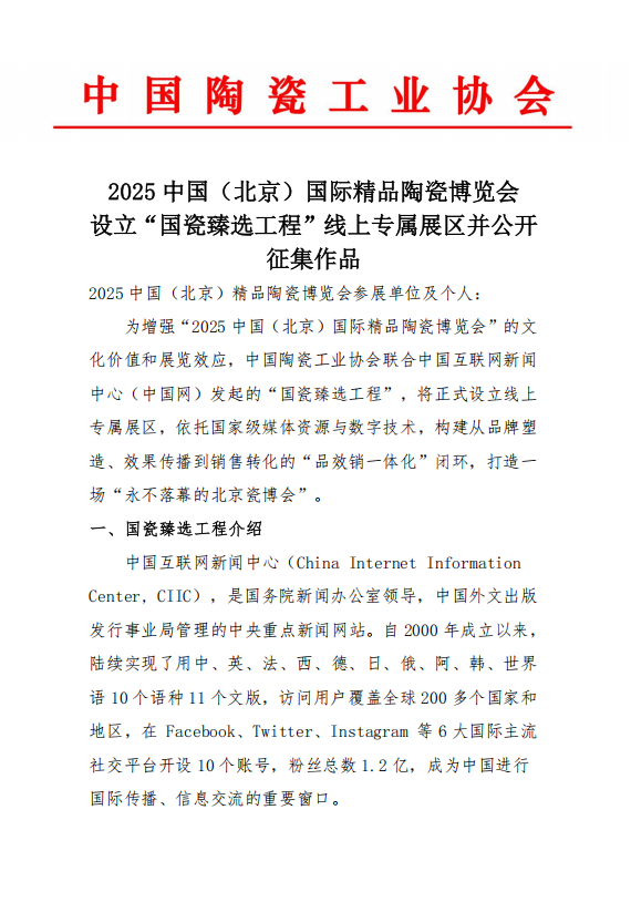 為進(jìn)一步拓寬陶瓷企業(yè)銷售渠道,提升展會(huì)文化價(jià)值與品牌效應(yīng),中國(guó)陶瓷工業(yè)協(xié)會(huì)將在“2025中國(guó)(北京)國(guó)際精品陶瓷博覽會(huì)”期間,聯(lián)合中國(guó)互聯(lián)網(wǎng)新聞中心(中國(guó)網(wǎng))共同啟動(dòng)“國(guó)瓷臻選工程”,并設(shè)立線上專屬展區(qū)。該工程旨在依托國(guó)家級(jí)媒體傳播力與數(shù)字技術(shù),構(gòu)建品牌塑造、效果傳播到銷售轉(zhuǎn)化的完整閉環(huán),打造“永不落幕的北京瓷博會(huì)”?,F(xiàn)面向全國(guó)陶瓷藝術(shù)家、工藝美術(shù)師、產(chǎn)瓷區(qū)及企業(yè)公開征集優(yōu)秀作品。通知如下:
