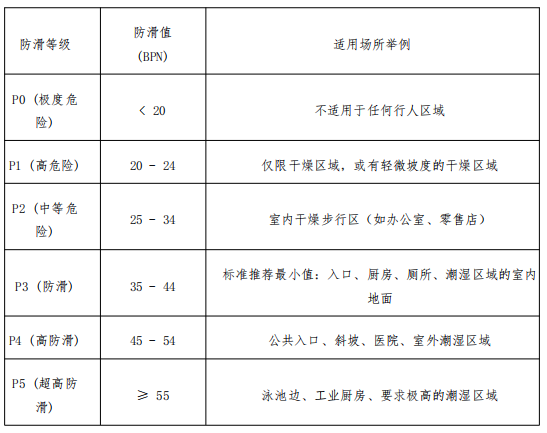 根據(jù)上述測試方法的結(jié)果,材料被劃分為不同的防滑等級,從P0(極度危險)到P5(超高防滑)。