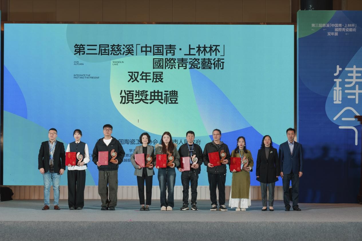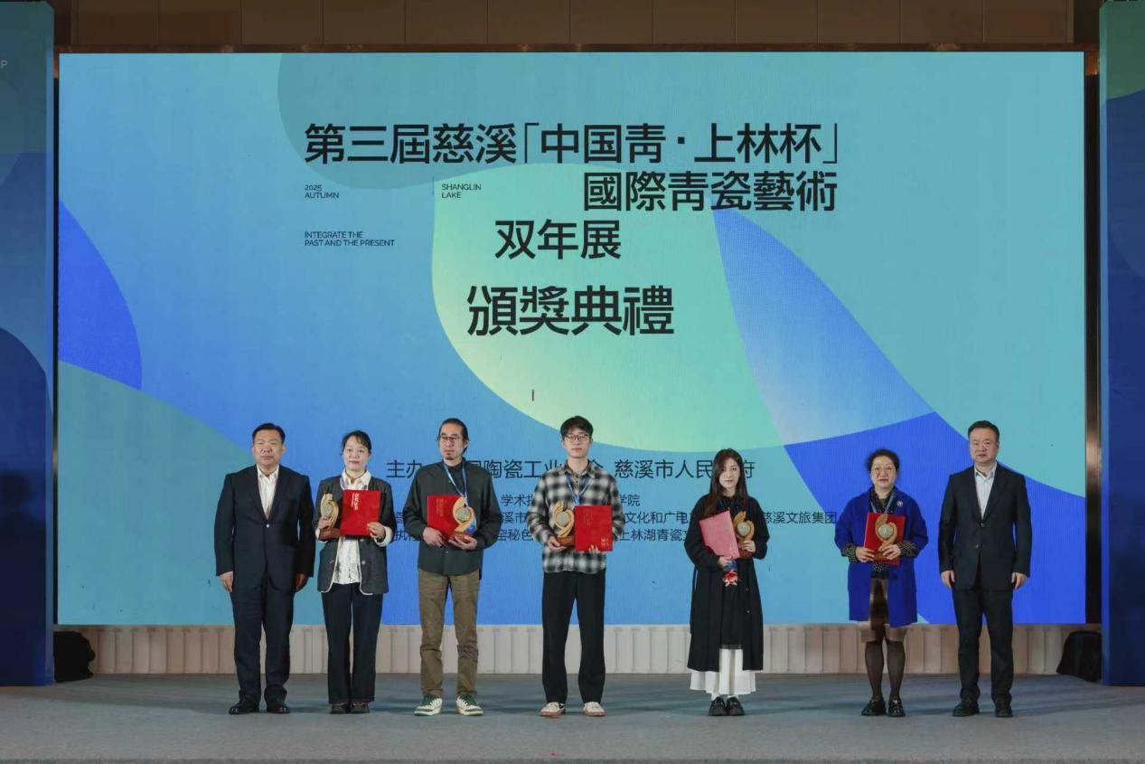 中國(guó)陶瓷工業(yè)協(xié)會(huì)劉挺理事長(zhǎng)等領(lǐng)導(dǎo)為獲獎(jiǎng)藝術(shù)家頒發(fā)榮譽(yù)證書(shū)與獎(jiǎng)牌。期待青瓷藝術(shù)家更加堅(jiān)定的傳承秘色瓷技藝、擁有探索青瓷現(xiàn)代表達(dá)的信心,未來(lái)繼續(xù)以作品為媒,講好中國(guó)青瓷故事。