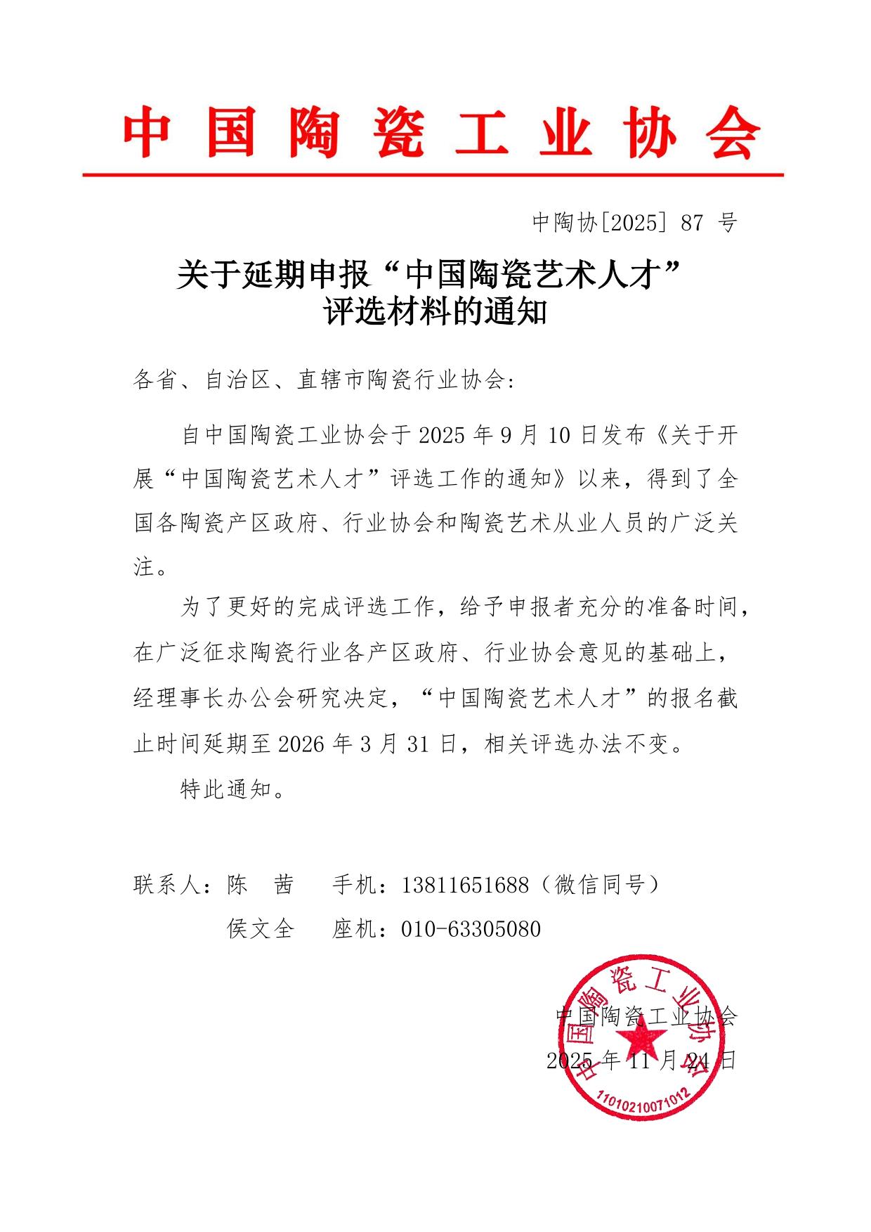 關(guān)于延期申報“中國陶瓷藝術(shù)人才”評選材料的通知