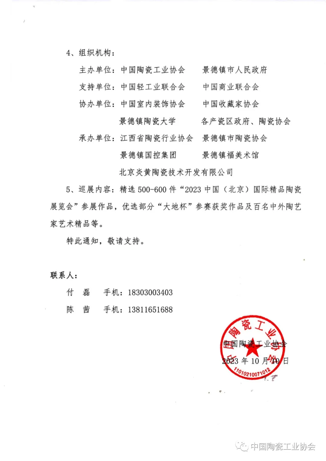 5、巡展內(nèi)容:精選500-600件“2023中國(北京)國際精品陶瓷展覽會”參展作品,優(yōu)選部分“大地杯”參賽獲獎作品及百名中外陶藝家藝術(shù)精品等。