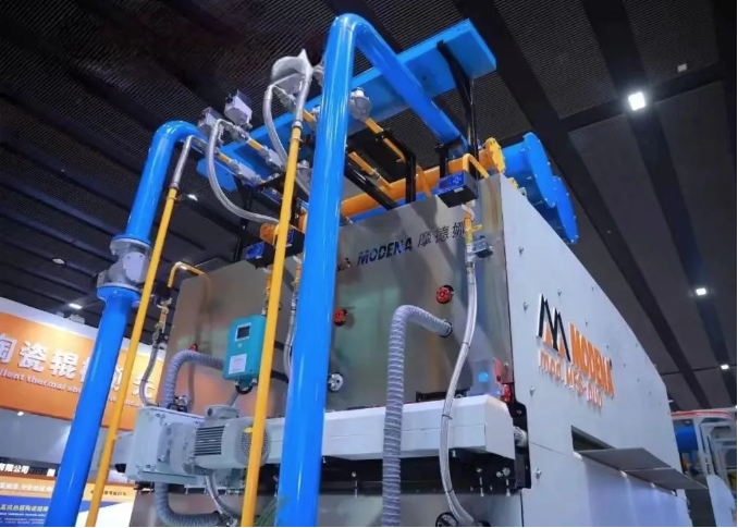 在技術創(chuàng)新層面,多家企業(yè)亮出了最新的科研成果與智能化技術。如薩克米展示了可搭配使用的SDP噴墨打印機和DDG干粒打印機,墨水和干粒協(xié)調打印,呈現無與倫比的紋理質感和3D效果;中鵬熱能的第三代智能巡窯系統(tǒng),可以實現窯爐全過程安全監(jiān)控;摩德娜推出了行業(yè)首創(chuàng)九層干燥窯,兼具產量大、效率高、切換快、節(jié)能好等優(yōu)點;賀祥的智能馬桶高壓成型工作站,一個搬運機器人負責6個成型工位的送坯、取坯、自動涂泥,并可隨意靈活地配置坐便款型;蘭科智能最新推出的六軸機器人具備6個關節(jié),自由靈活,可適應任何碼包方式,定位精準,重復定位±0.02㎜;金博特展出了雙伺服傳動磨邊機,智能高效、兼容性強,對角線精度高(誤差在0.05毫米內);銳博機電的智能瓷磚拋底機,是一款針對瓷磚背面氧化物清潔而研發(fā)的設備,可以幫助陶企擺脫“瓷磚底坯脫模劑”的困境......