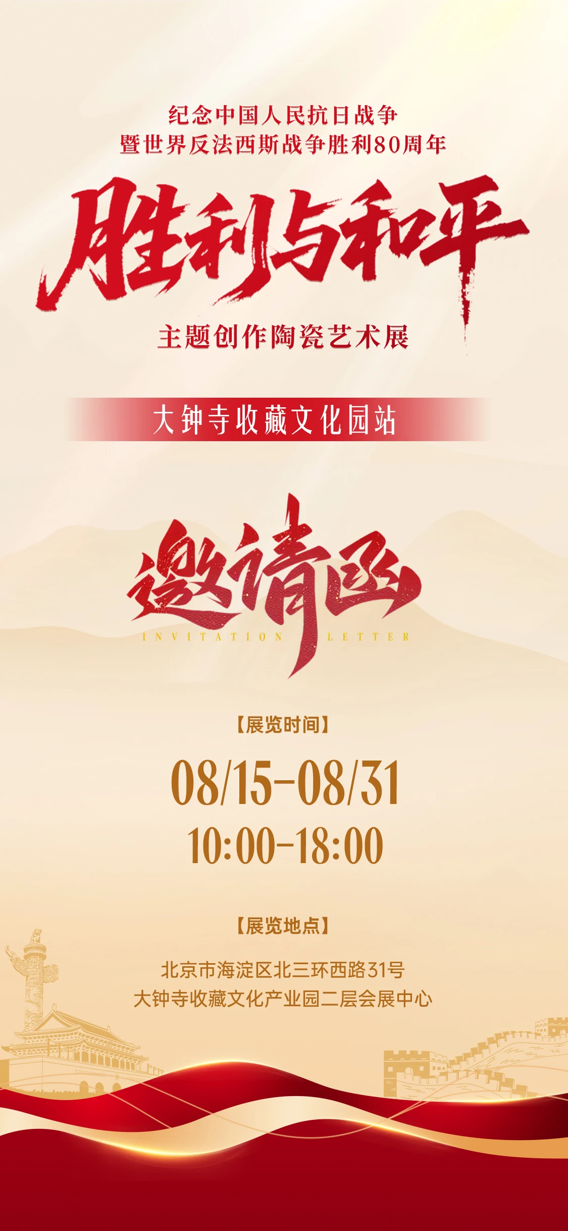 為紀(jì)念中國(guó)人民抗日戰(zhàn)爭(zhēng)暨世界反法西斯戰(zhàn)爭(zhēng)勝利80周年,“勝利與和平—紀(jì)念中國(guó)人民抗日戰(zhàn)爭(zhēng)暨世界反法西斯戰(zhàn)爭(zhēng)勝利80周年”主題創(chuàng)作陶瓷藝術(shù)展于8月15日正式遷至北京市海淀區(qū)北三環(huán)西路31號(hào)大鐘寺收藏文化產(chǎn)業(yè)園二層會(huì)展中心,展覽將持續(xù)至8月31日,每日10:00-18:00對(duì)公眾開(kāi)放。本次展覽以“銘記歷史、珍愛(ài)和平”為主線,通過(guò)百余件陶瓷藝術(shù)精品與書(shū)畫(huà)名家創(chuàng)作的深度融合,打造沉浸式愛(ài)國(guó)主義教育課堂,同時(shí)搭建跨領(lǐng)域藝術(shù)交流平臺(tái),推動(dòng)陶瓷文化與首都多元文化的創(chuàng)新互鑒。
