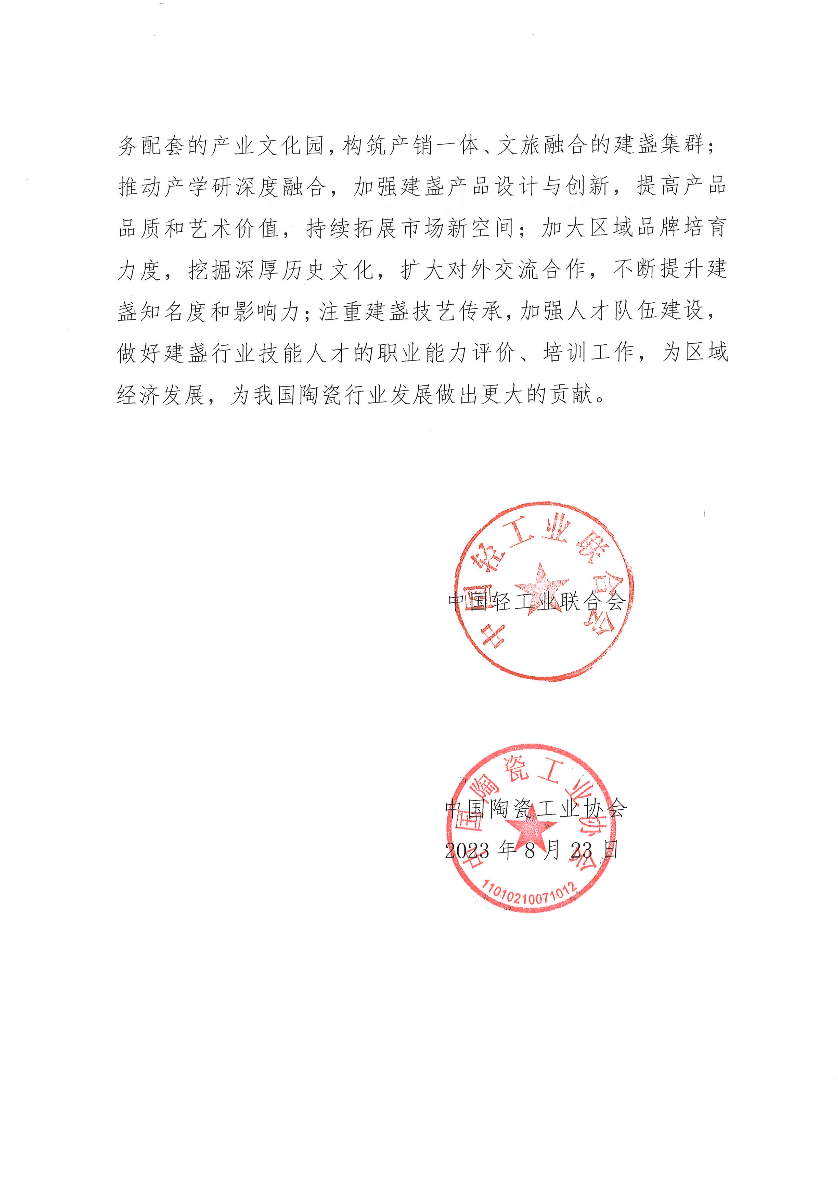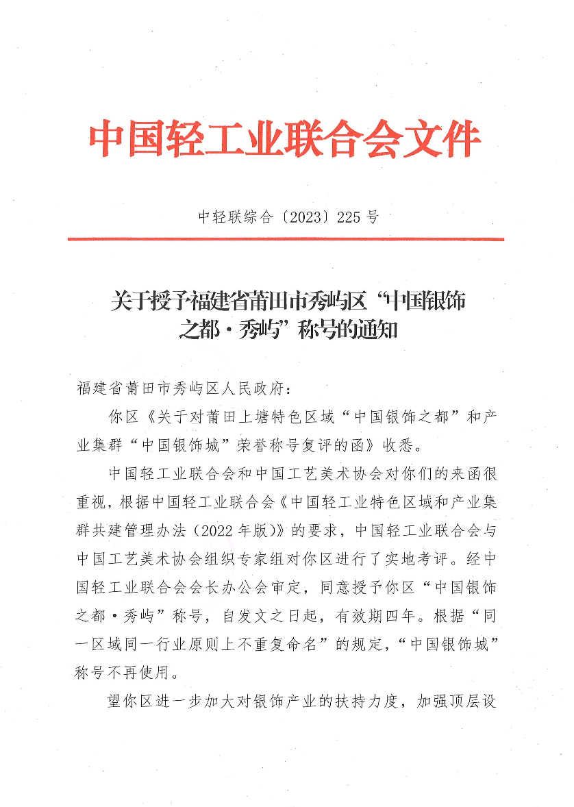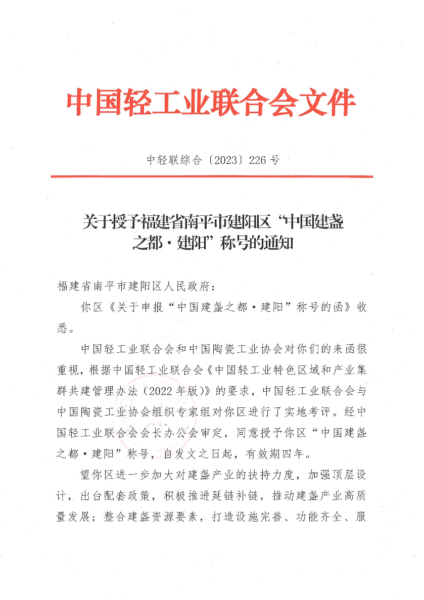 近期,中國輕工業(yè)聯(lián)合會(huì)發(fā)布關(guān)于授予廣西壯族自治區(qū)欽州市“中國坭興陶之都·欽州”稱號、福建省莆田市秀嶼區(qū)“中國銀飾之都·秀嶼”稱號、福建省南平市建陽區(qū)“中國建盞之都·建陽”稱號的通知,根據(jù)中國輕工業(yè)聯(lián)合會(huì)《中國輕工業(yè)特色區(qū)域和產(chǎn)業(yè)集群共建管理辦法(2022 年版)》的要求,中國輕工業(yè)聯(lián)合會(huì)與相關(guān)協(xié)會(huì)共同組織專家組對廣西壯族自治區(qū)欽州市、福建省莆田市秀嶼區(qū)、福建省南平市建陽區(qū)進(jìn)行了實(shí)地考評。經(jīng)中國輕工業(yè)聯(lián)合會(huì)會(huì)長辦公會(huì)審定,同意授予廣西壯族自治區(qū)欽州市“中國坭興陶之都·欽州”稱號、福建省莆田市秀嶼區(qū)“中國銀飾之都·秀嶼”稱號、福建省南平市建陽區(qū)“中國建盞之都·建陽”稱號,自發(fā)文之日起,有效期四年。