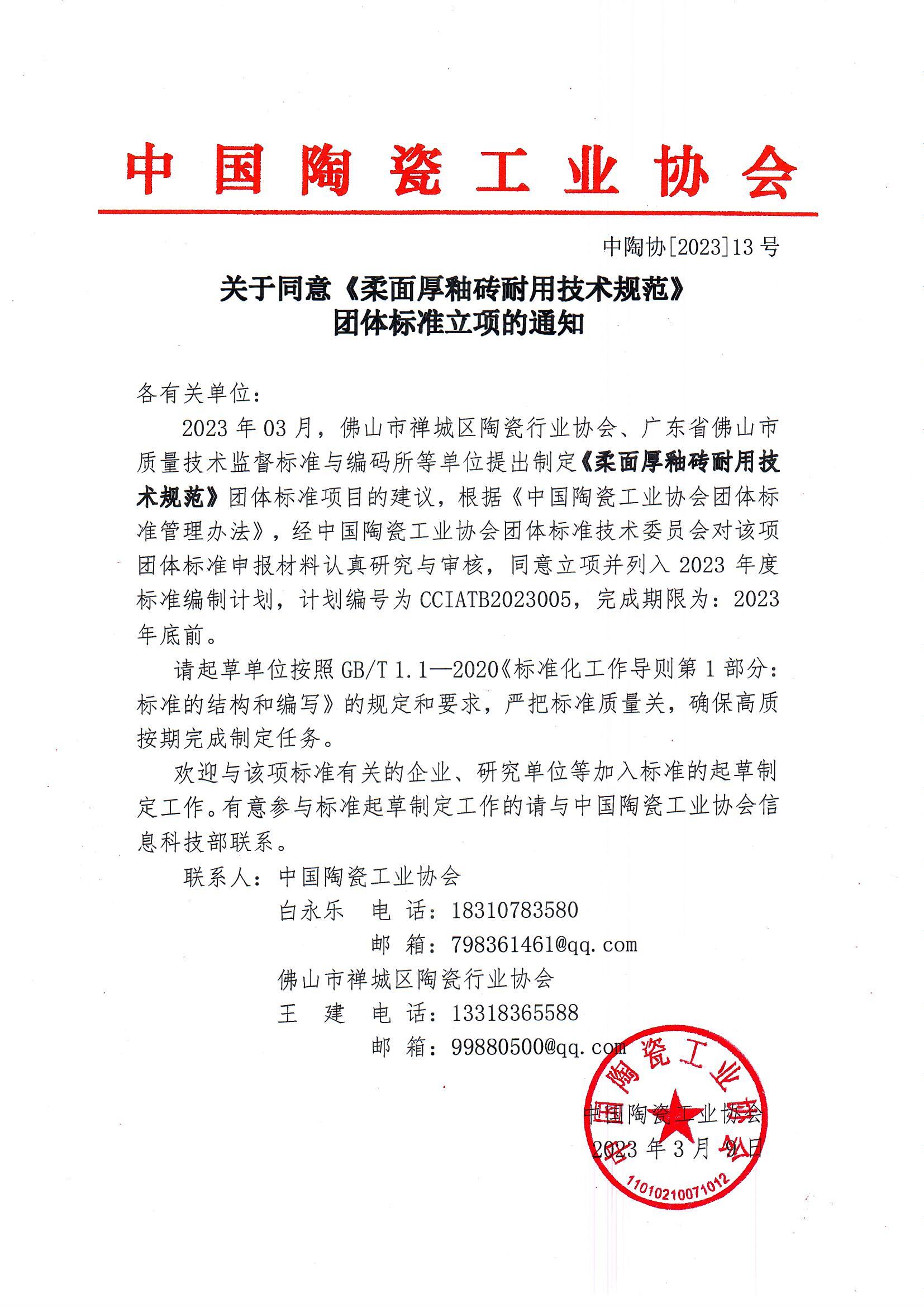 2023年03月,佛山市禪城區(qū)陶瓷行業(yè)協(xié)會(huì)、廣東省佛山市質(zhì)量技術(shù)監(jiān)督標(biāo)準(zhǔn)與編碼所等單位提出制定《柔面厚釉磚耐用技術(shù)規(guī)范》團(tuán)體標(biāo)準(zhǔn)項(xiàng)目的建議,根據(jù)《中國(guó)陶瓷工業(yè)協(xié)會(huì)團(tuán)體標(biāo)準(zhǔn)管理辦法》,經(jīng)中國(guó)陶瓷工業(yè)協(xié)會(huì)團(tuán)體標(biāo)準(zhǔn)技術(shù)委員會(huì)對(duì)該項(xiàng)團(tuán)體標(biāo)準(zhǔn)申報(bào)材料認(rèn)真研究與審核,同意立項(xiàng)并列入2023年度標(biāo)準(zhǔn)編制計(jì)劃,計(jì)劃編號(hào)為CCIATB2023005,完成期限為:2023年底前。