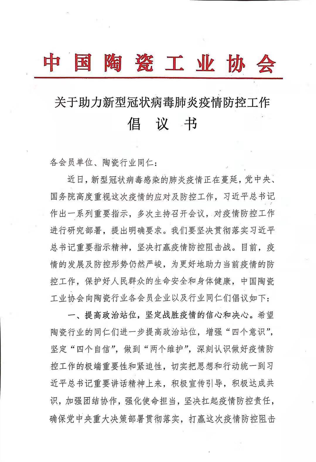 近日,新型冠狀病毒感染的肺炎疫情正在蔓延,黨中央、國務院高度重視這次疫情的應對及防控工作,習近平總書記作出一系列重要指示,多次主持召開會議,對疫情防控工作進行研究部署,提出明確要求。我們要堅決貫徹落實習近平總書記重要指示精神,堅決打贏疫情防控阻擊戰(zhàn)。目前,疫情的發(fā)展及防控形勢仍然嚴峻,為更好地助力當前疫情的防控工作,保護好人民群眾的生命安全和身體健康,中國陶瓷工業(yè)協(xié)會向陶瓷行業(yè)各會員企業(yè)以及行業(yè)同仁們倡議如下: