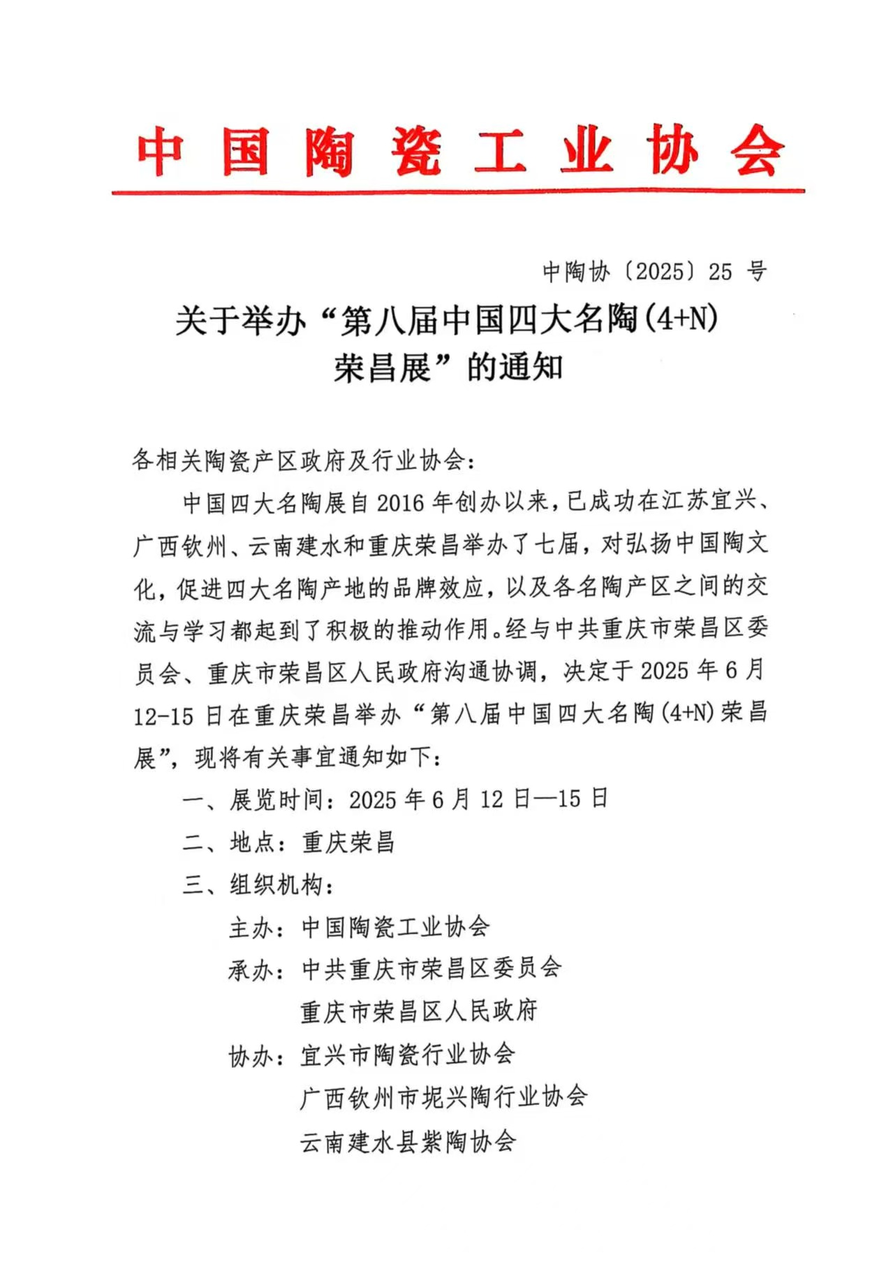 關(guān)于舉辦“第八屆中國四大名陶(4+N)榮昌展”的通知