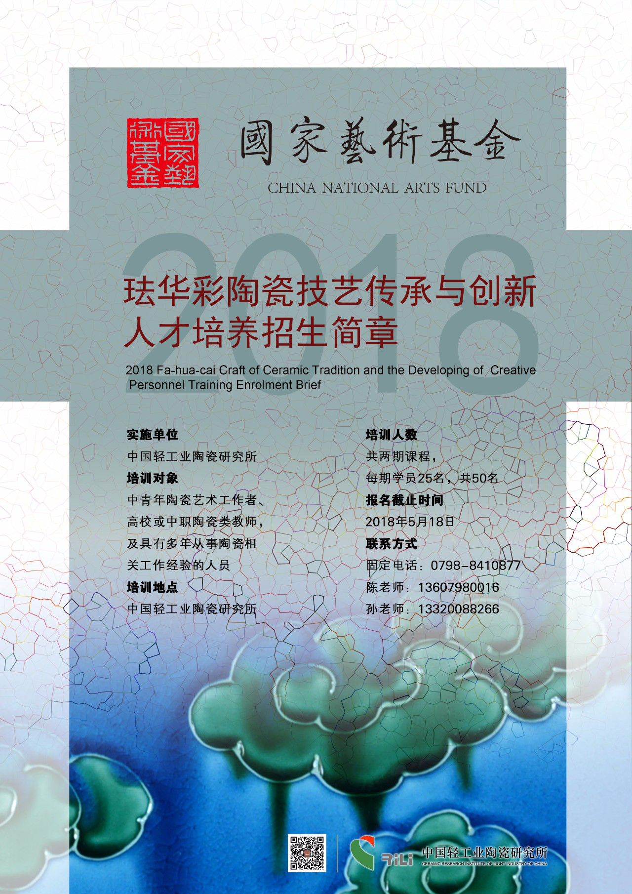 為響應(yīng)“一帶一路”的總體戰(zhàn)略部署,推動(dòng)我國瀕臨失傳的傳統(tǒng)技法—琺華彩陶瓷技藝的傳承與發(fā)展,根據(jù)國家藝術(shù)基金章程的相關(guān)規(guī)定和本項(xiàng)目的培養(yǎng)計(jì)劃,以中國輕工業(yè)陶瓷研究所為主體實(shí)施的“國家藝術(shù)基金2018年度藝術(shù)人才培養(yǎng)資助項(xiàng)目《琺華彩陶瓷技藝傳承與創(chuàng)新人才培養(yǎng)》”,面向全國公開招收學(xué)員。