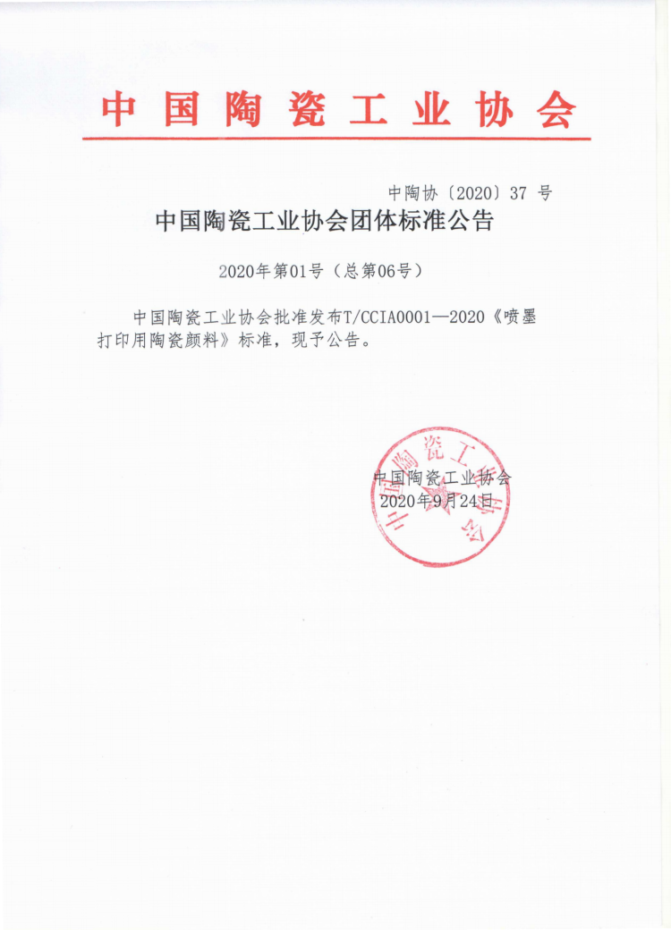 中國陶瓷工業(yè)協(xié)會批準(zhǔn)發(fā)布T/CCIA0001—2020《噴墨打印用陶瓷顏料》標(biāo)準(zhǔn),現(xiàn)予公告。?