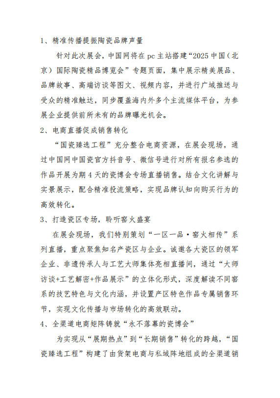 為進(jìn)一步拓寬陶瓷企業(yè)銷售渠道,提升展會(huì)文化價(jià)值與品牌效應(yīng),中國(guó)陶瓷工業(yè)協(xié)會(huì)將在“2025中國(guó)(北京)國(guó)際精品陶瓷博覽會(huì)”期間,聯(lián)合中國(guó)互聯(lián)網(wǎng)新聞中心(中國(guó)網(wǎng))共同啟動(dòng)“國(guó)瓷臻選工程”,并設(shè)立線上專屬展區(qū)。該工程旨在依托國(guó)家級(jí)媒體傳播力與數(shù)字技術(shù),構(gòu)建品牌塑造、效果傳播到銷售轉(zhuǎn)化的完整閉環(huán),打造“永不落幕的北京瓷博會(huì)”?,F(xiàn)面向全國(guó)陶瓷藝術(shù)家、工藝美術(shù)師、產(chǎn)瓷區(qū)及企業(yè)公開征集優(yōu)秀作品。通知如下: