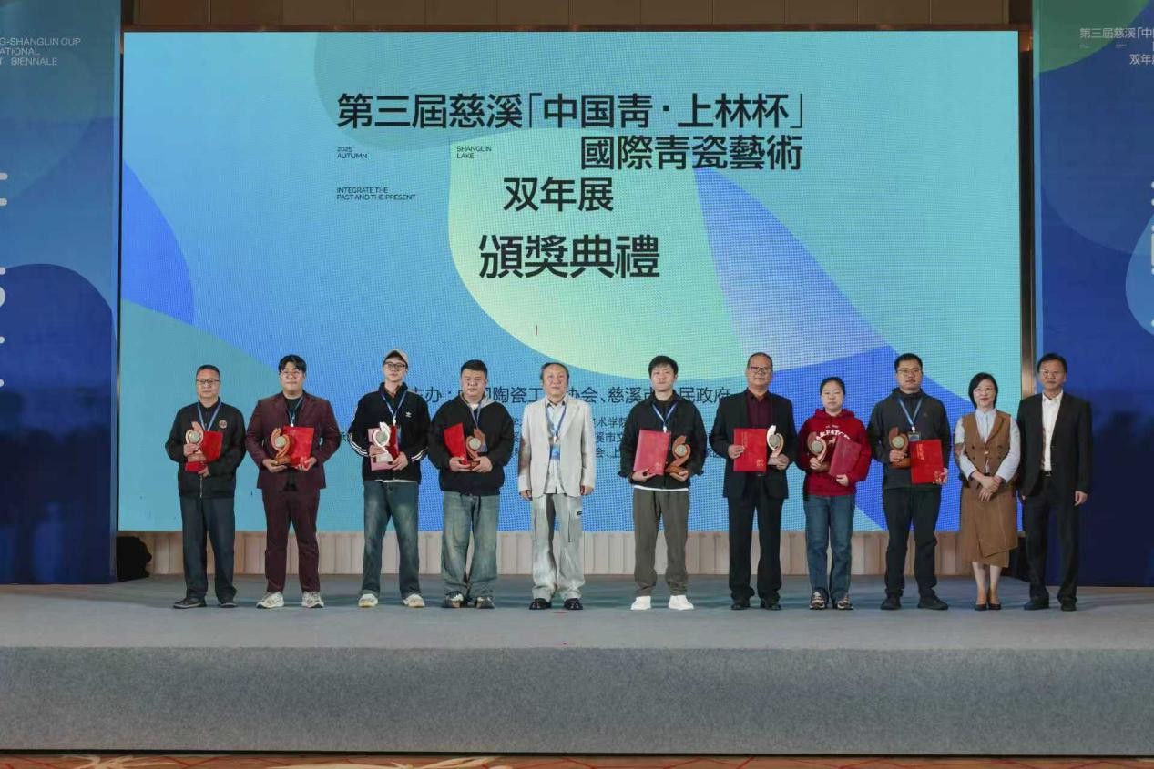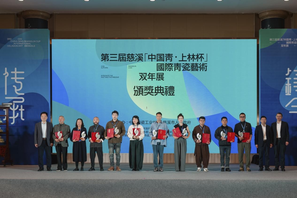 中國(guó)陶瓷工業(yè)協(xié)會(huì)劉挺理事長(zhǎng)等領(lǐng)導(dǎo)為獲獎(jiǎng)藝術(shù)家頒發(fā)榮譽(yù)證書(shū)與獎(jiǎng)牌。期待青瓷藝術(shù)家更加堅(jiān)定的傳承秘色瓷技藝、擁有探索青瓷現(xiàn)代表達(dá)的信心,未來(lái)繼續(xù)以作品為媒,講好中國(guó)青瓷故事。