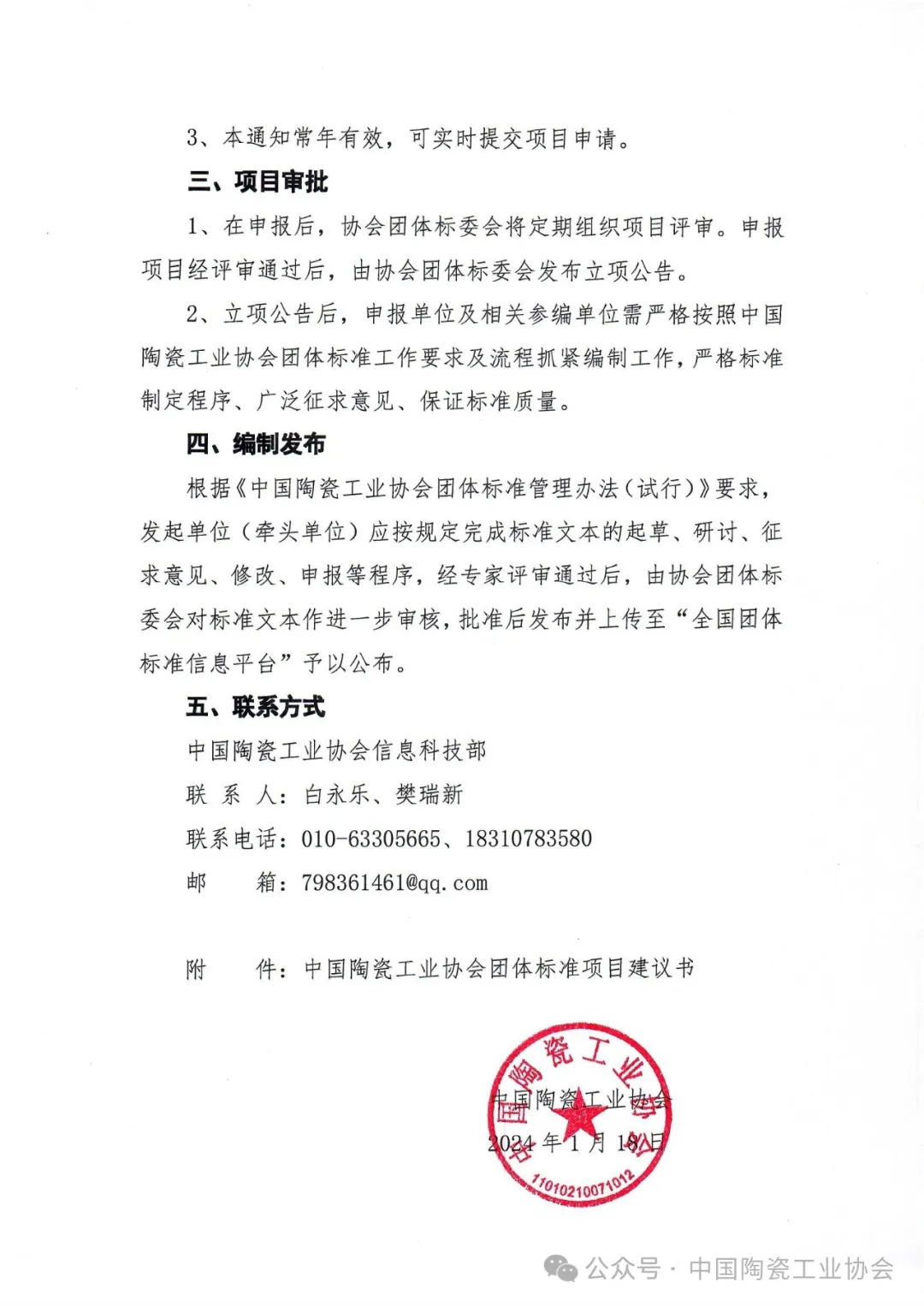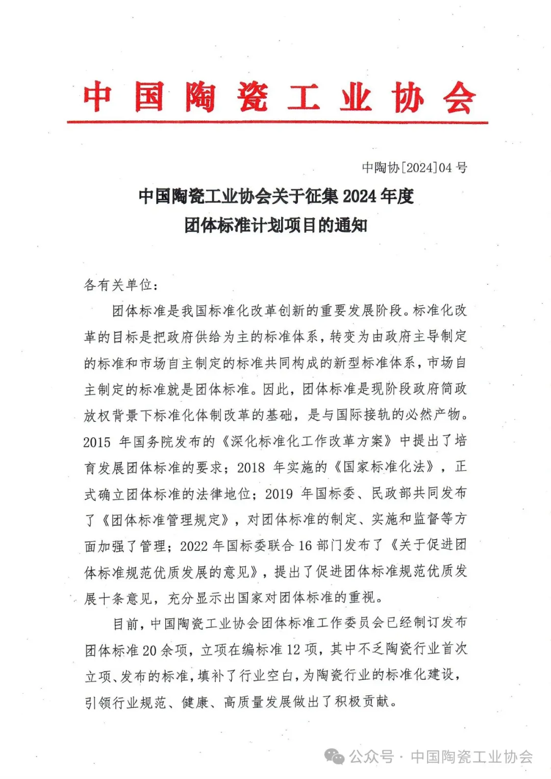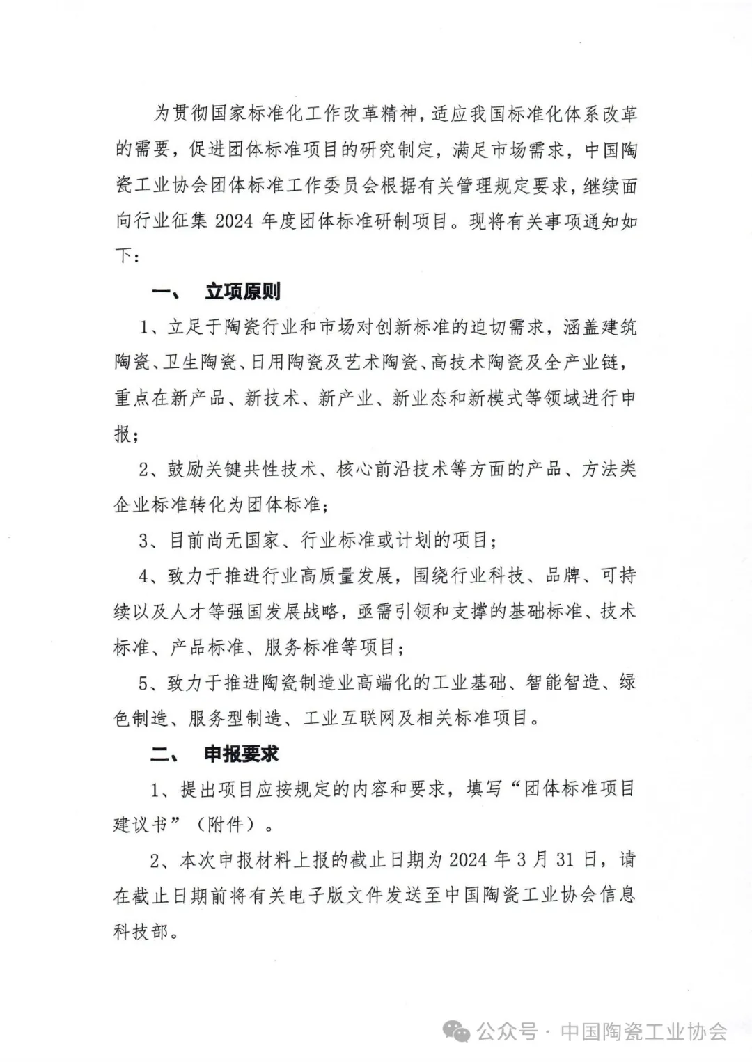 中國陶瓷工業(yè)協(xié)會(huì)團(tuán)體標(biāo)準(zhǔn)項(xiàng)目建議書