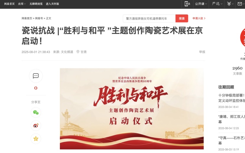 搜狐、網(wǎng)易、新浪、優(yōu)酷、騰訊、愛(ài)奇藝等網(wǎng)絡(luò)媒體:紛紛開(kāi)辟專題頁(yè)面,全方位呈現(xiàn)展覽盛況。報(bào)道特別指出:“陶瓷藝術(shù)的脆弱與堅(jiān)韌,恰如和平之珍貴與不易,每一件作品都在用獨(dú)特的藝術(shù)語(yǔ)言訴說(shuō)著那段可歌可泣的歷史。