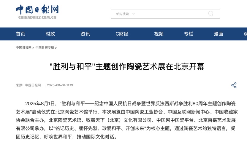 中國(guó)網(wǎng)不僅在核心位置上線“勝利與和平”陶瓷藝術(shù)展大型專題頁(yè)面,更在展覽現(xiàn)場(chǎng)特別搭建專業(yè)訪談間,邀請(qǐng)參展藝術(shù)家、專家學(xué)者進(jìn)行深度對(duì)話。專題中集納了豐富展覽資訊,及時(shí)傳遞最新動(dòng)態(tài);并打造線上展覽,提供沉浸式觀展體驗(yàn),讓未能親臨現(xiàn)場(chǎng)的觀眾也能領(lǐng)略藝術(shù)魅力;還設(shè)有訪談實(shí)錄,帶觀眾走進(jìn)藝術(shù)家的創(chuàng)作世界,聆聽(tīng)作品背后的故事;同時(shí)匯聚專家學(xué)者的真知灼見(jiàn),呈現(xiàn)多元嘉賓觀點(diǎn)。